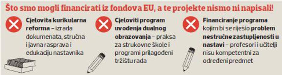 Za druge projekte, osim spomenuta tri, nije bilo znatnijeg interesa. U tri godine nismo se dovoljno pripremili da bismo osigurali 85 milijuna eura, koliko možemo dobiti, a taj je iznos namijenjen modernizaciji strukovnog obrazovanja te podizanju njegove kvalitete radi povećanja zapošljivosti učenika i mogućnosti za daljnje obrazovanje.