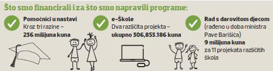 No zato smo e-Školama dali apsolutnu prevagu – za taj smo pilot-projekt, kroz koji će se školama omogućiti korištenje suvremenih tehnologija te će se poticati racionalizacija i transparentnost poslovanja kroz informatizaciju poslovnih i administrativnih procesa, novac EU povlačili kroz dva programa – Operativnim programom Konkurentnost i kohezija i Operativnim programom Učinkoviti ljudski potencijali. Tako ukupna vrijednost pilot-projekta e-Škole iznosi 306,853.186 kuna, od kojih se 193,690.148 financira iz Europskog fonda za regionalni razvoj i 67,135.059 iz Europskog socijalnog fonda, dok je iznos nacionalnog sufinanciranja 46,027.977 kuna. To su iznosi predviđeni do 28. veljače 2018. godine, do kada će se provoditi pilot-projekt e-Škole, a tek nakon rezultata pilot-projekta, u razdoblju od 2019. do 2022., planira se provesti i veliki projekt putem kojeg će sve škole u Republici Hrvatskoj postati e-Škole.