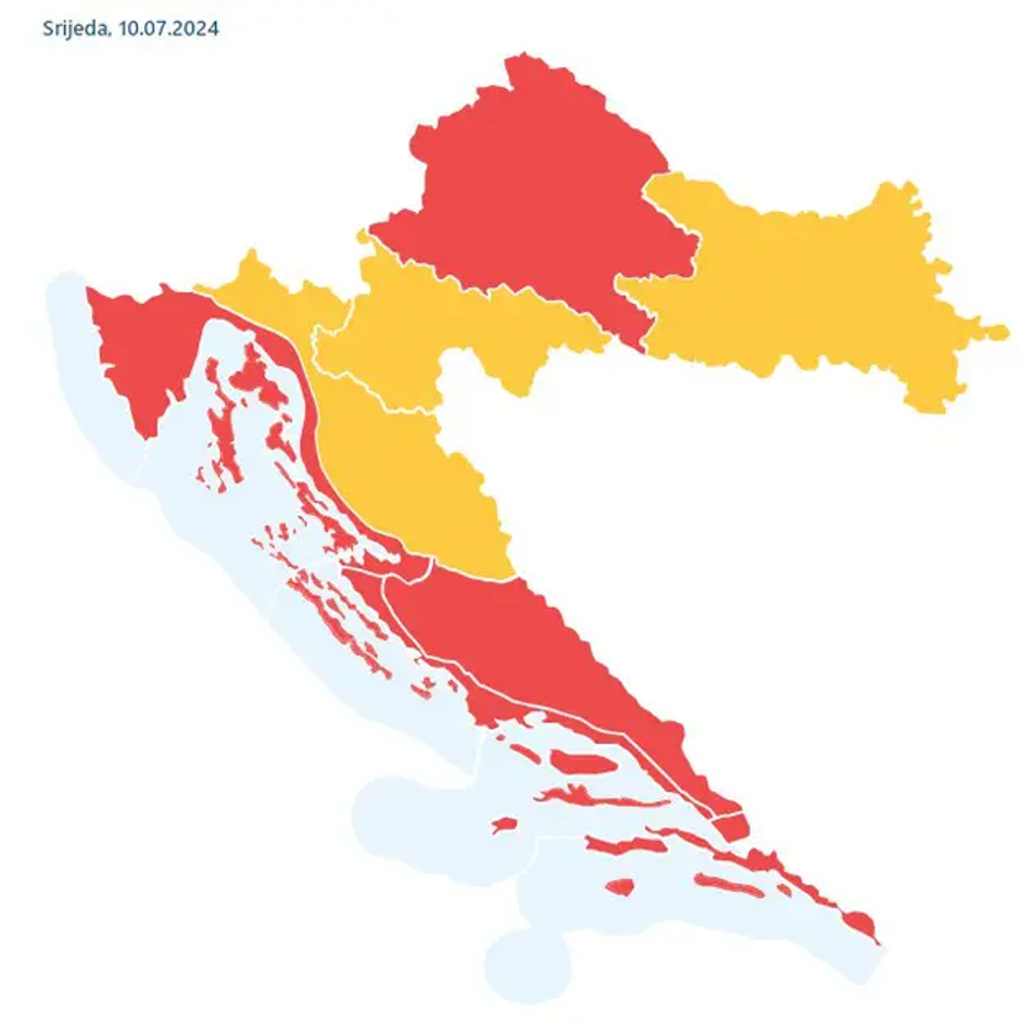Za područje cijele Hrvatske trenutno je na snazi meteoalarm zbog iznimno visokih temperatura, a vrhunac toplinskog vala očekuje se sutra u srijedu. Državni hidrometeorološki zavod prognozira da će najviša dnevna temperatura u utorak većinom biti između 31 i 36 °C. Upozorenje ističe ekstremno visoke temperature koje posebno mogu ugroziti osjetljivu populaciju, uključujući starije osobe i malu djecu.