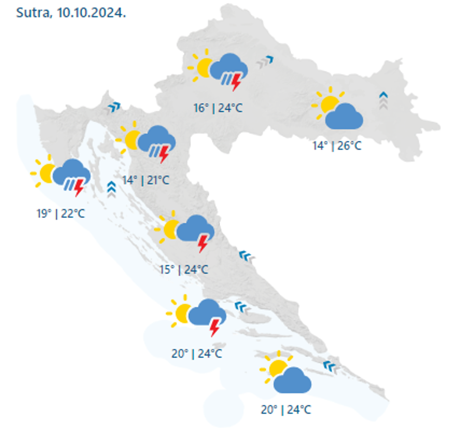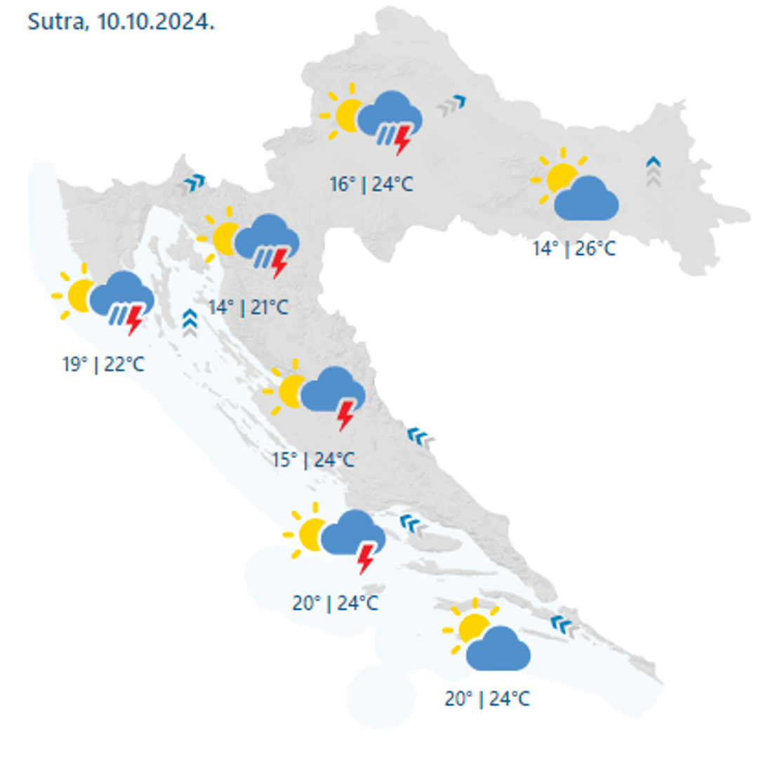 Na istoku će sutra prijepodne biti sunčano, dok će popodne doći do porasta naoblake. Kiša će na zapad stići tek navečer. Vjetar će biti umjeren, a temperature će se kretati do 28°C. U središnjim dijelovima očekujemo djelomično sunčano prijepodne, a popodne rast naoblake s mogućim pljuskovima, uglavnom u noći na petak. Temperature će ujutro biti oko 16°C, dok će popodne dostići oko 25°C, prognozira HRT.
