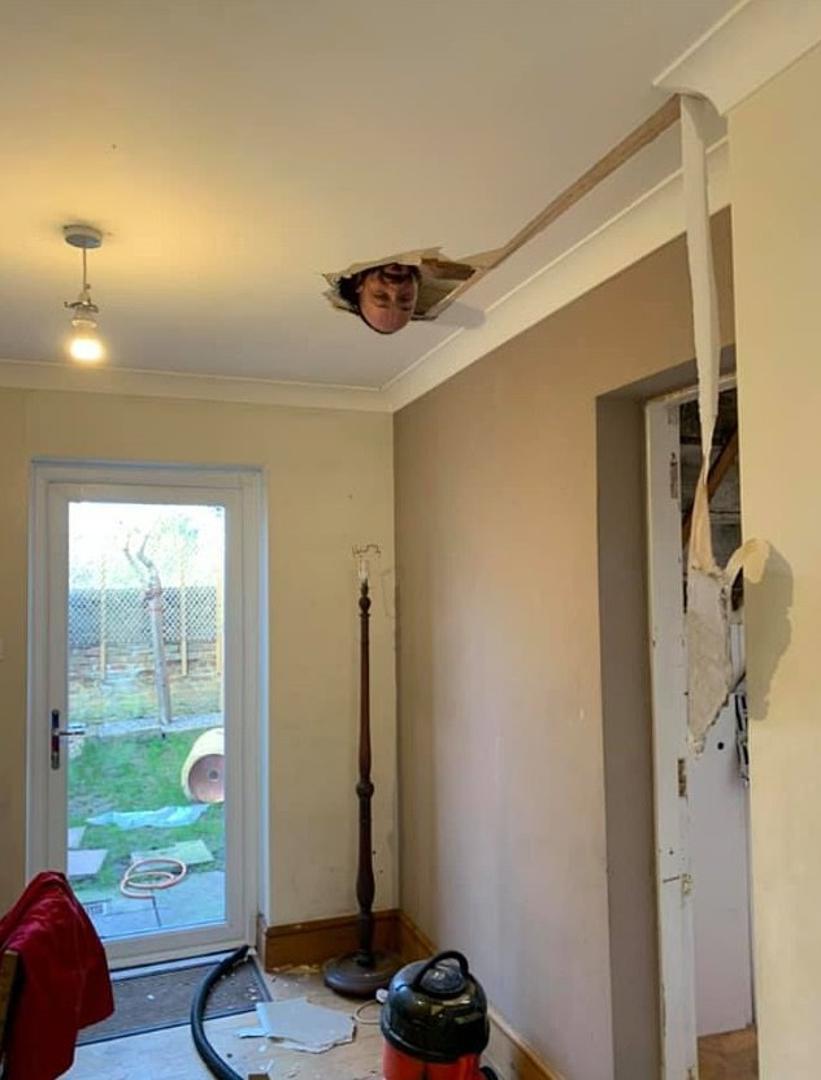 – Provela sam cijelo jutro čisteći prašinu koja se stvorila nakon vađenja stubišta. Stala sam samo na dvije minute. No onda je on propao kroz strop, možete zamisliti prašinu – napisala je ona u Facebook grupi Mrs Hinch Cleaning Tips te je uz to priložila fotografiju svoga partnera kako je gleda kroz rupu u stopu, piše Daily Mail.