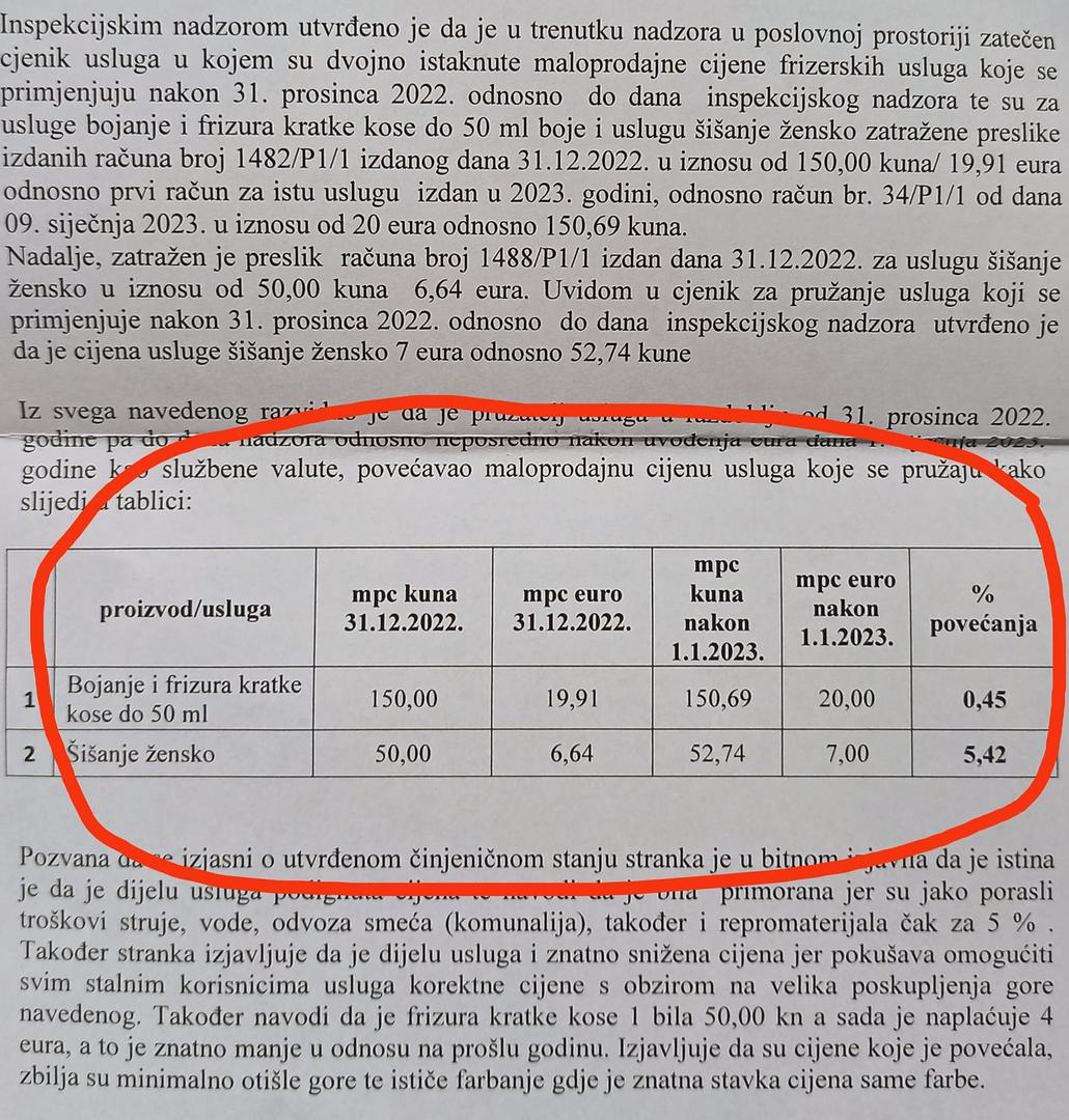 U frizerskom je salonu bojanje i frizura kratke kose do 50 ml naplaćivano 150 kuna, odnosno 19,91 eura, a nakon nove godine taj je iznos bio 150,69 kuna, odnosno 20 eura. Povećanje je to od 0,45%. Žensko šišanje prije Nove godine je iznosilo 50 kuna, odnosno 6,64 eura, a 1.1.2023. godine taj je iznos bio 52,74 kune odnosno 7 eura. Utvrđeno je povećanje od 5,42 posto, stoji u prekšajnom nalogu.