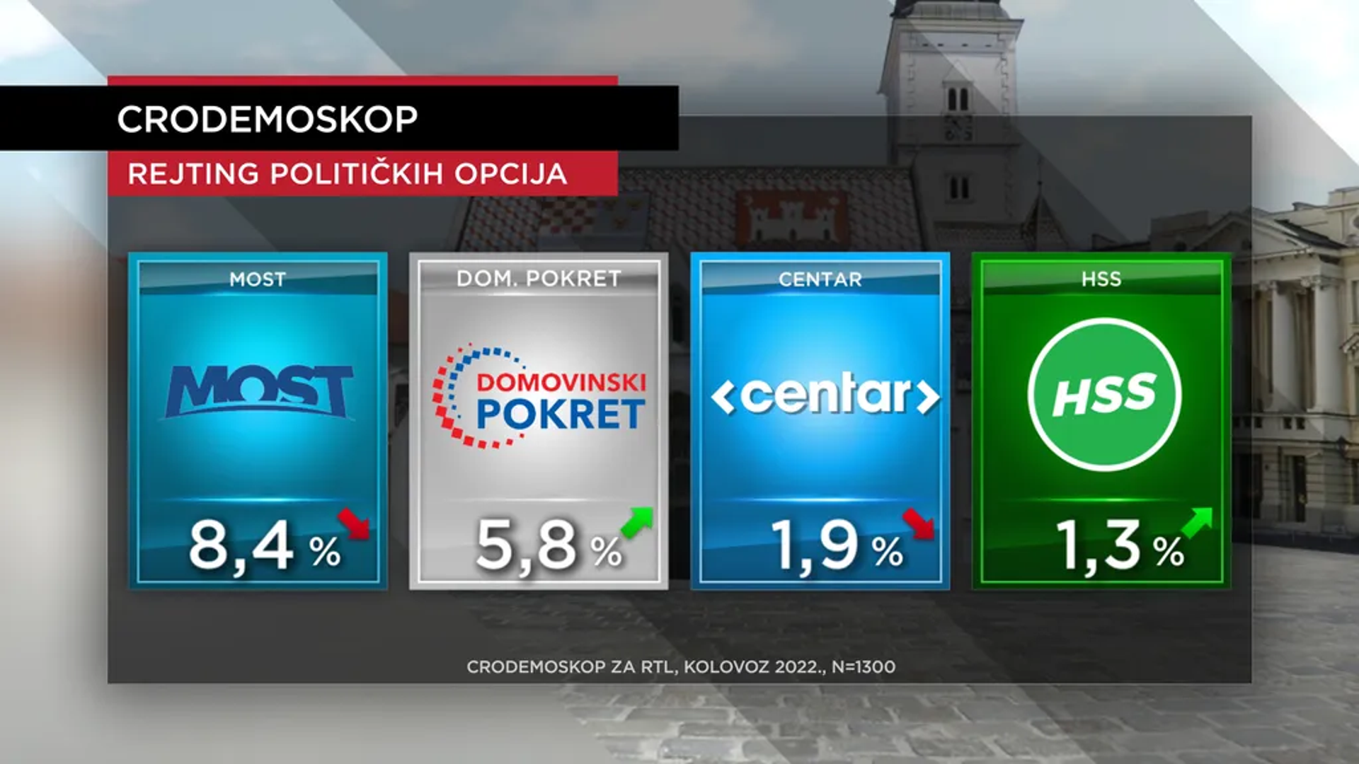 Samo je jedan međumjesečni dobitnik u odnosu na srpanj, a to je Domovinski pokret (0,4 postotna boda). Sve ostale stranke ispod su izbornog praga, CENTAR (1,9 posto), HSS i FOKUS (1,3 posto) i Radnička fronta (1,1 posto).