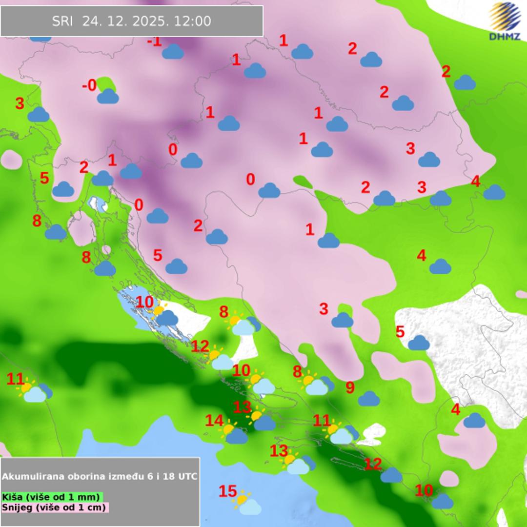 U utorak će biti kiše na Jadranu i predjelima uz njega, ponajprije na otocima u obliku pljuskova s grmljavinom, moguće i obilnijih. Iako je vjerojatnost mala, u Gorskoj Hrvatskoj se kiša može lediti. DHMZ dodaje kako će pritom puhati umjereno i jako jugo, navečer u jačanju na olujno. Potkraj dana, na sjevernom će dijelu Jadrana zapuhati bura, mjestimice s olujnim udarima. Dan kasnije, na Badnjak, oborina će biti češća i u unutrašnjosti.