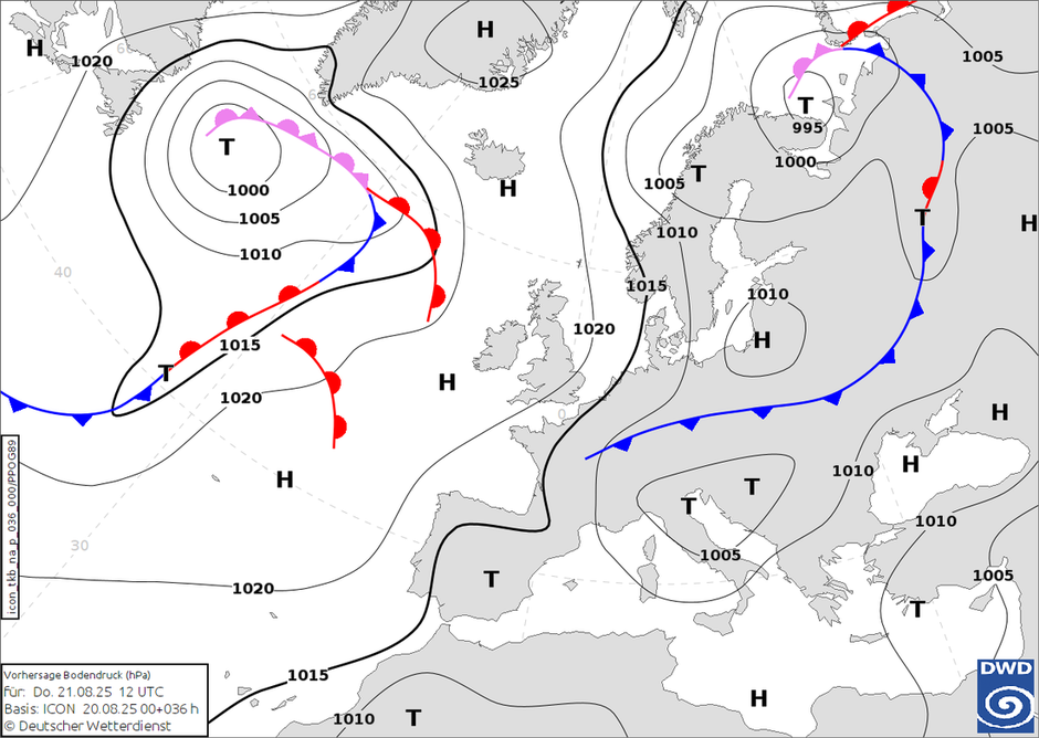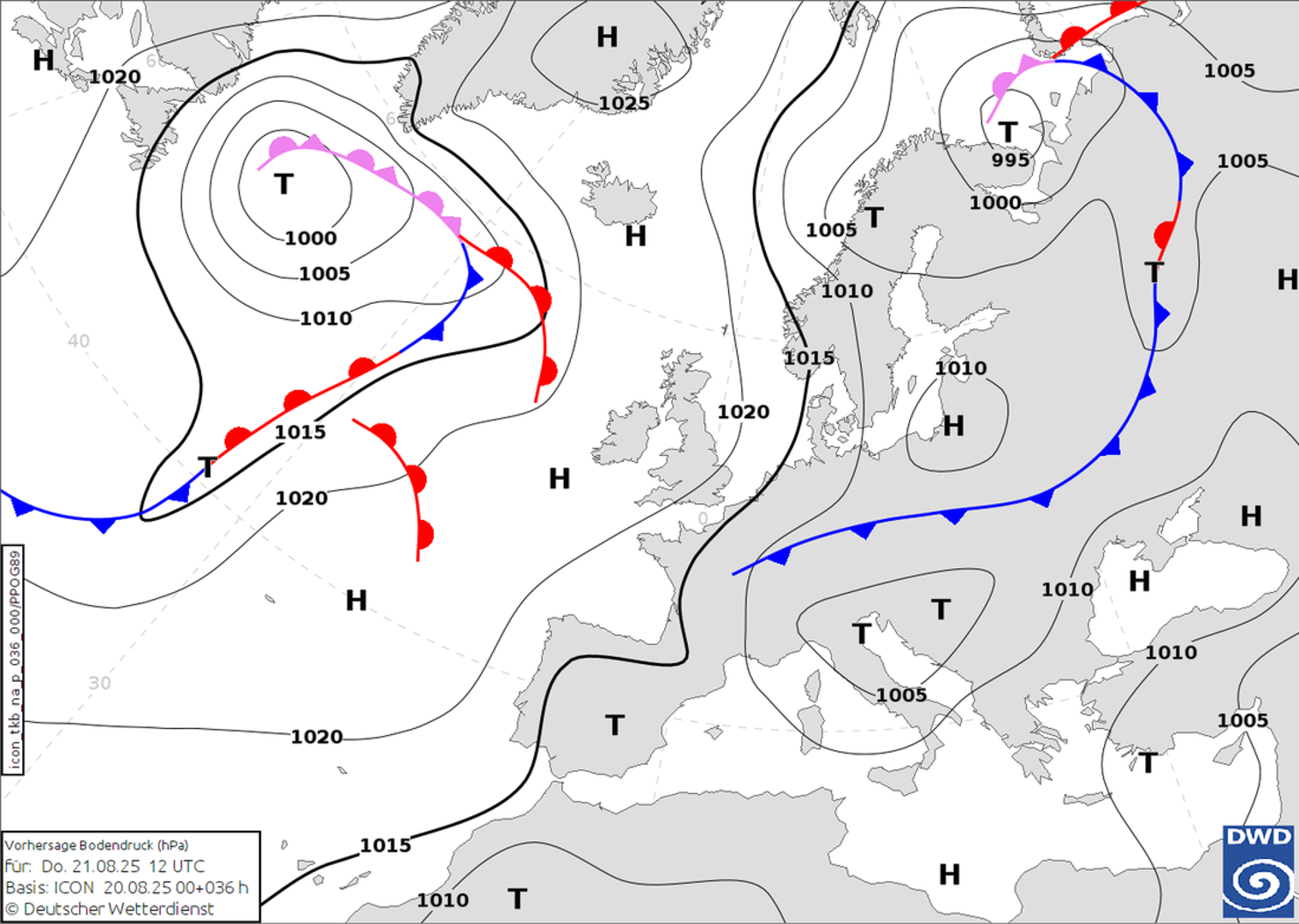 U prizemnom polju tlaka ciklona će se iz Sredozemnog mora premjestiti u četvrtak, 21. kolovoza, nad sjever Italije i sjeverni Jadran (Slika 1.) te potom nastaviti put preko naših krajeva dalje na sjeveroistok u petak, 22. kolovoza, kada će se od sjevera preko naših područja premjestiti hladna fronta s kojom će stići malo hladniji zrak.