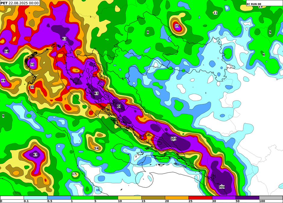 Termobarička dolina nad zapadnom Europom, u sklopu koje se nalazi i visinska ciklona, spuštat će se u Sredozemlje i tijekom petka, 22. kolovoza 2025., premještati se preko Hrvatske. Na prednjoj strani te doline u jugozapadnom strujanju nad naše krajeve pristiže vlažan i ujedno nestabilan zrak.