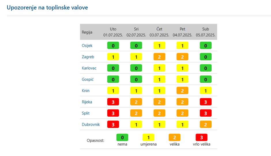 Sutra se kiša ne očekuje jer će nad našim krajevima ostati topli i suhi zrak pod utjecajem anticiklone. Na istoku zemlje u srijedu će biti obilje sunca i vruće, s najvišim temperaturama oko 32, 33 stupnja i jutarnjima od 14 do 18. Puhat će povremeno umjeren istočni i jugoistočni vjetar, slično kao i u središnjim krajevima, gdje će danju biti do 34 stupnja. Opasnost od toplinskog vala bit će umjerena.