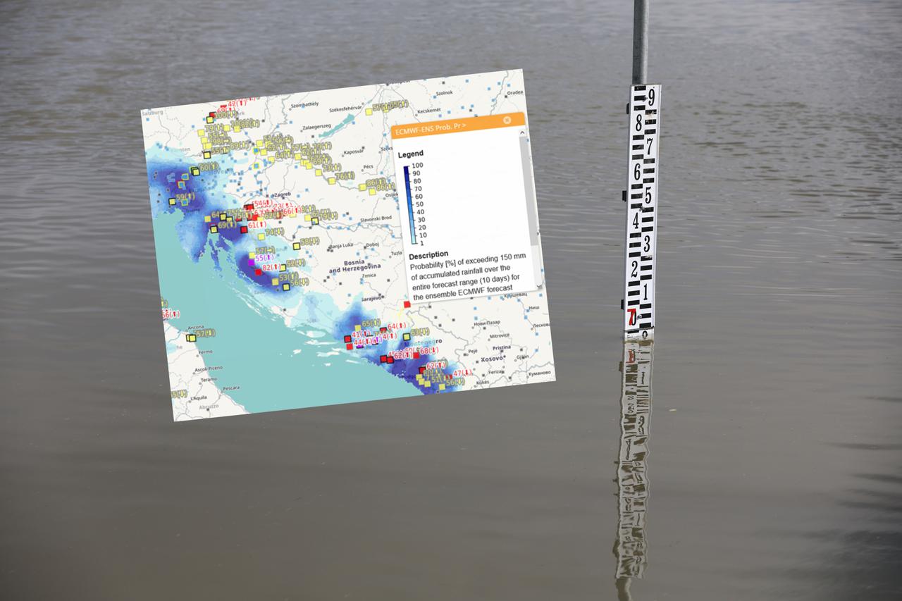 Europski centar za srednjoročne vremenske prognoza (ECMWF) za područja zapadne Slovenije, jadranske obale i zaleđa, Gorskog kotara i Like daje visoke izglede za obilne oborine (iznad 150 mm) u narednih deset dana od kojih će se glavnina ostvariti do ovog vikenda, pojašnjava DHMZ te dodaje kako hidrološki model Europskog sustava upozorenja na poplave (EFAS) ukazuje na značajnu mogućnost pojave velikih voda na Rječini, Kupi, Dobri, Mrežnici, Korani, Glini, Uni, Lici, Gackoj, Zrmanji, ali i Savi, Muri i Dravi sljedećih dana.