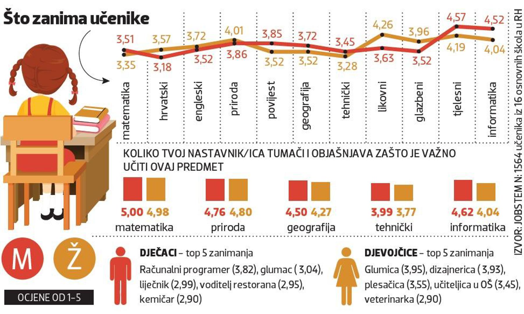 Iako je danas na prirodoslovno-matematičkim i tehničkim fakultetima još uvijek znatno manje studentica nego njihovih muških kolega, sadašnji osnovci smatraju da su ta, tzv. STEM zanimanja, podjednako i za djevojke i dečke. Ipak, djevojčicama se najviše sviđaju umjetnička zanimanja, a dječacima istraživačka i ona iz STEM područja.