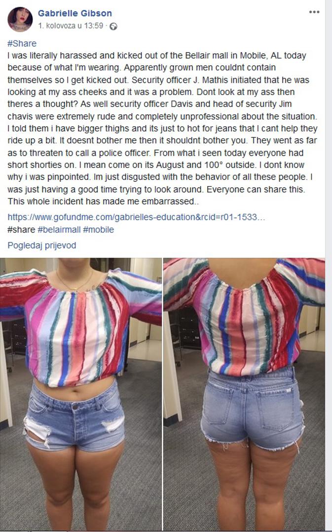 – Doslovno sam posramljena i izbačena iz trgovačkog centra jer se odrasli muškarci nisu mogli suzdržati. Zaštitar J. Mathis sam je priznao da je gledao moju stražnjicu i to je bio problem. Pomislila sam 'pa nemoj je onda gledati' – napisala je u objavi na Facebook i dodala: