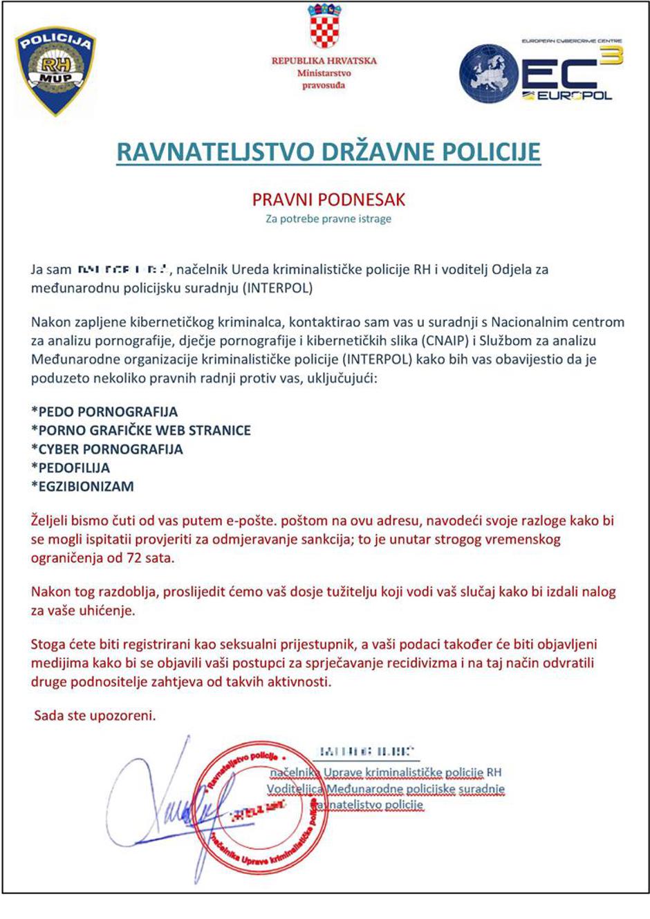 - U petak, 16. rujna 2022. godine na veći broj adresa elektroničke pošte različitih primatelja u Hrvatskoj dostavljena je lažna poruka u kojoj se nepoznata osoba predstavlja kao rukovoditelj organizacijske jedinice Uprave kriminalističke policije te navodi kako je primatelj poruke osumnjičen za više različitih kaznenih djela i traži od primatelja da odgovori na poruku, a sve s ciljem pribavljanja protupravne imovinske koristi - navode iz policije.
