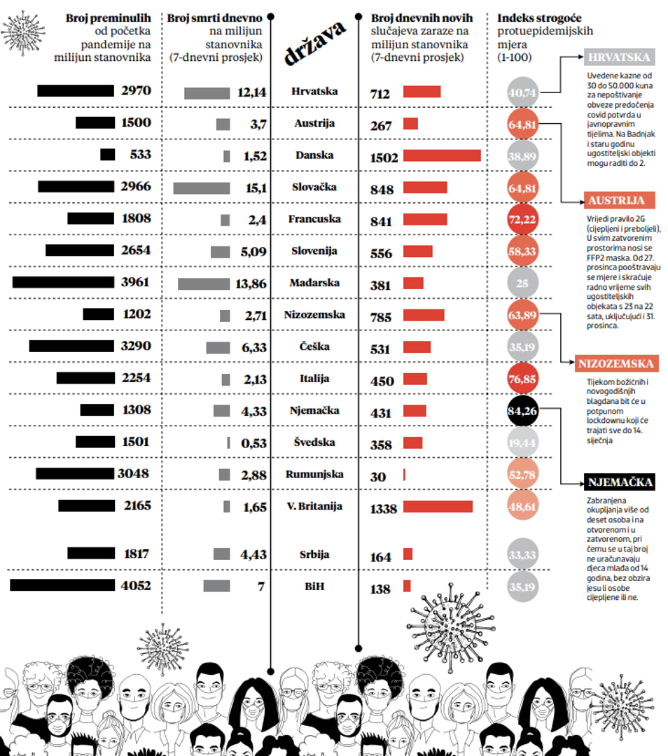 – Međutim, s obzirom na to da je COVID-19 koji uzrokuje omikron-varijanta još nepotpuno jasna i relativna nepoznanica svijetu pa tako i nama, vjerujem da je mudro i opravdano pričekati s popuštanjem mjera i postupati u skladu s preporukama međunarodnih zdravstvenih institucija, onako kako to čine i ostale zemlje EU upravo s ciljem da se spriječi reverzija i porast novozaraženih, odnosno mehanički ventiliranih i hospitaliziranih, pa u konačnici i preminulih pacijenata. Nemojmo zaboraviti da je situacija u Hrvatskoj specifična, u samom smo vrhu po broju preminulih od COVID-19. Sigurno nam to ne ide u prilog i može se očekivati da ćemo vjerojatno i nastaviti s ovim žalosnim trendom, ne budemo li bili spremni za najgore. Dakle, u ovo blagdansko vrijeme medijske najave ne pokazuju nikakvih ozbiljnih ograničenja ni promjena u smislu ograničenja za razliku od europskih država gdje se znatno više i strože provode epidemiološke mjere tijekom blagdana. U Europi se može očekivati da to čine zbog opreza radi nepoznanice bolesti koju uzrokuje omikron-varijanta i stoga vjerujem da je opravdano postupiti oprezno jer je to jedino što nam daju kakvo-takvo jamstvo da se nećemo vratiti onim brojevima koji su bili dominantno u prethodnom mjesecu – kaže dr. Bekavac.