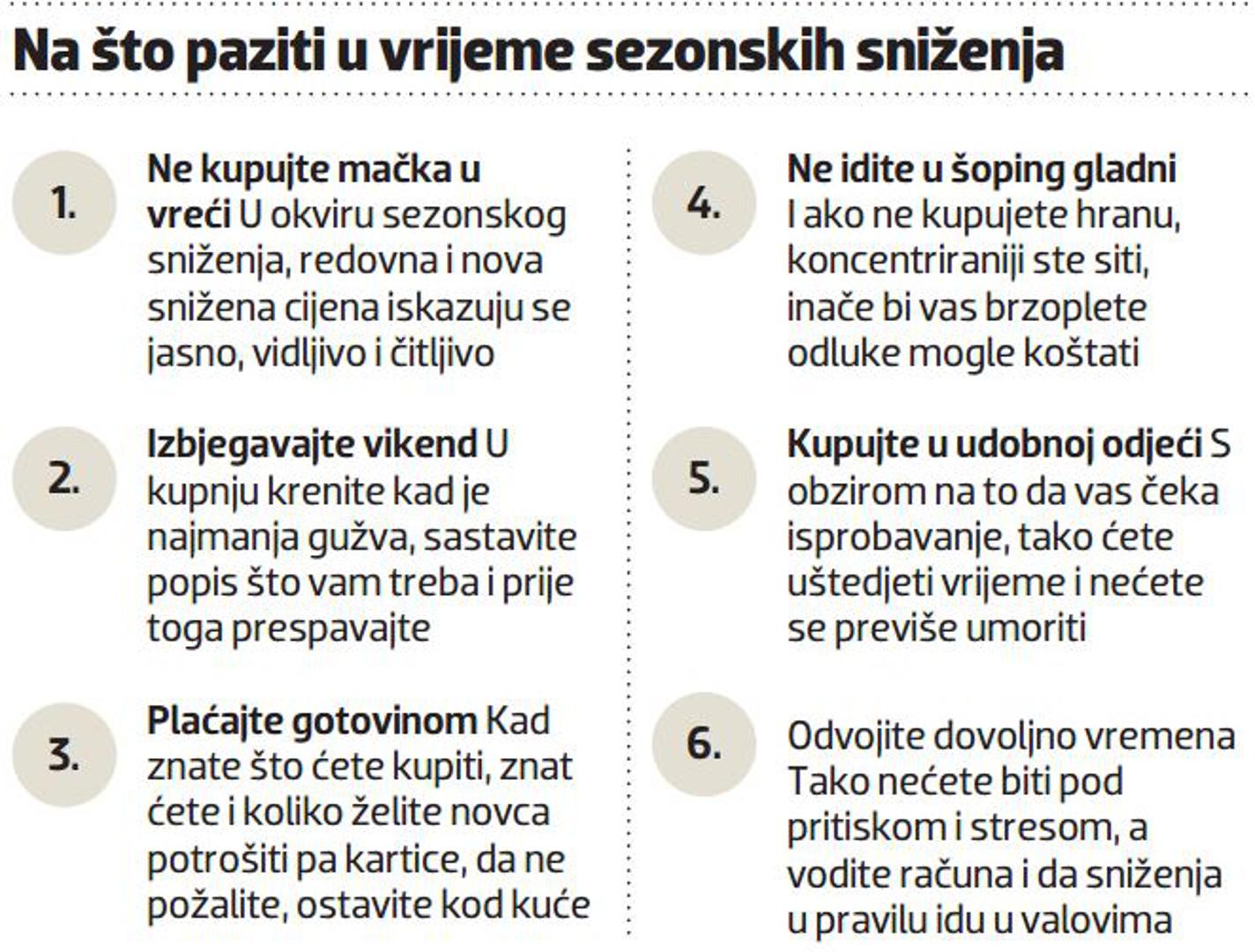 Ovako, preostaje samo nada da ćemo s jučerašnjim agresivnim natpisima domaćih trgovaca o početku zimskih sniženja od 50, pa i do 70% doista nešto i pronaći po najnižoj cijeni, a da zadovolji naša očekivanja i ukuse. A usto i popravi poslovično slab siječanj kada zapravo i nemamo puno za trošiti i držimo kako je svako sniženje ispod 70% udarac na zdrav razum koji nas tjera da se iznova preispitamo treba li nam baš ta haljina, cipele, sat, komad namještaja...