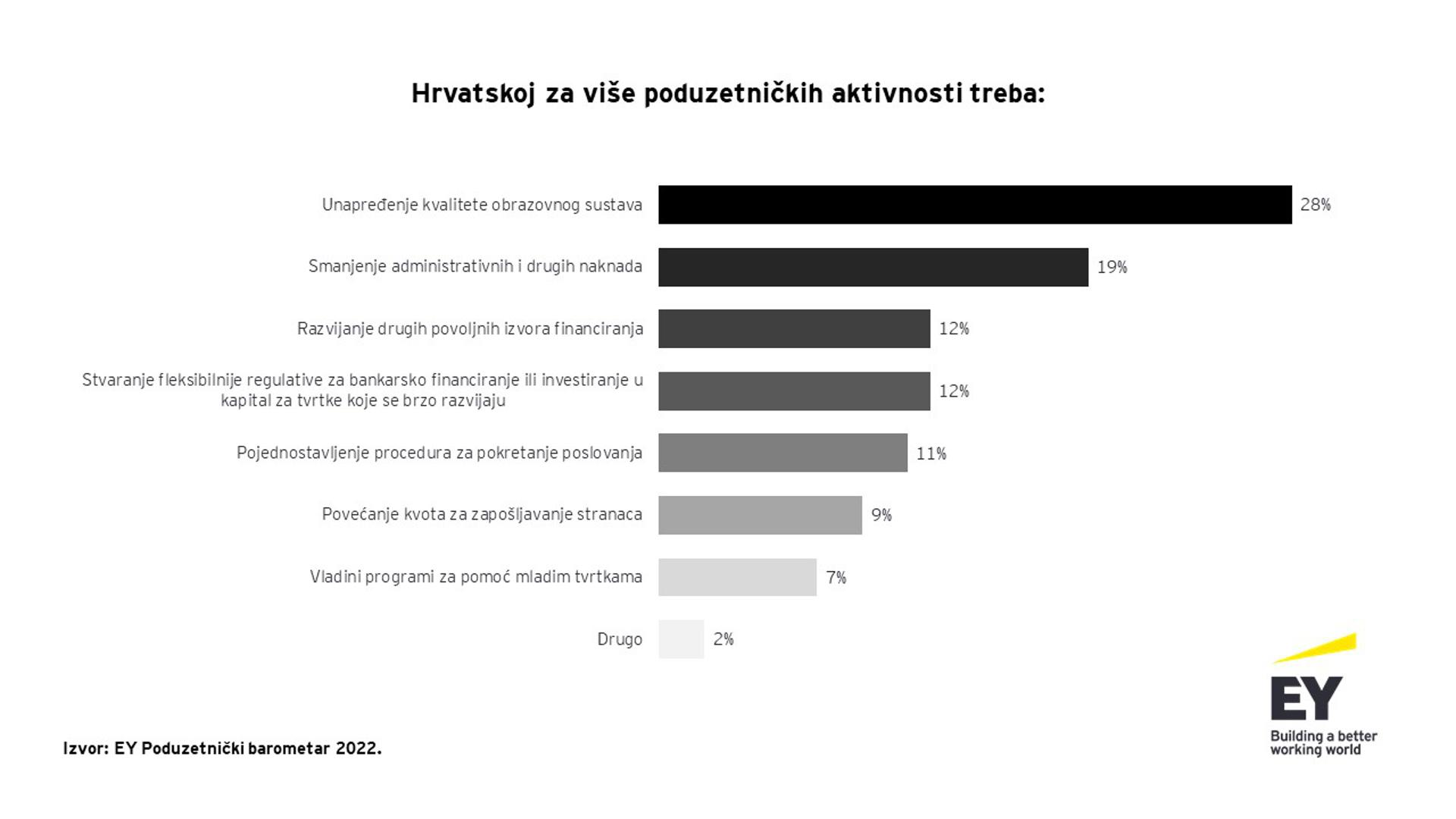 Pored navedenih inicijativa porezne regulative, značajan utjecaj na unapređenje poduzetničkih aktivnosti u Hrvatskoj prema domaćim bi poduzetnicima imalo i unaprjeđenje kvalitete obrazovnog sustava (28 posto) te smanjenje administrativnih i drugih naknada (19 posto).
