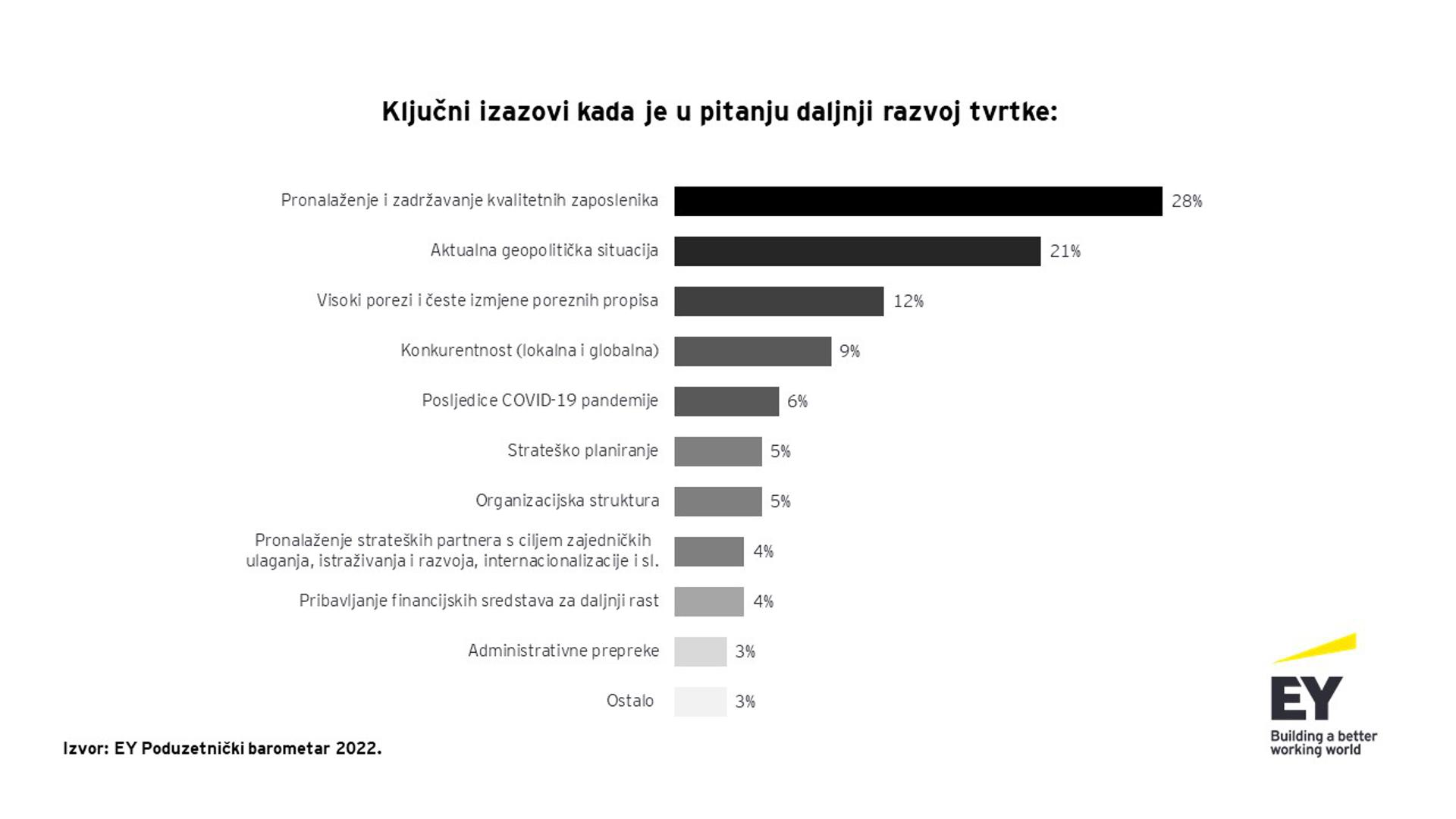 U kontekstu izazova za koje poduzetnici smatraju da će najviše utjecati na daljnji razvoj tvrtke, glavnina ispitanika (28 posto) smatra kako najveći izazov predstavlja pronalaženje i zadržavanje kvalitetnih zaposlenika. Pored toga, poduzetnike brinu i barijere zbog aktualne geopolitičke situacije (21 posto), a navedene izazove poduzetnici ističu i kada je u pitanju širenje na međunarodno tržište. Ipak, prema mišljenju poduzetnika, nova valuta euro doprinijet će međunarodnom poslovanju i osvajanju novih tržišta, kao i uspješnosti poslovanja.