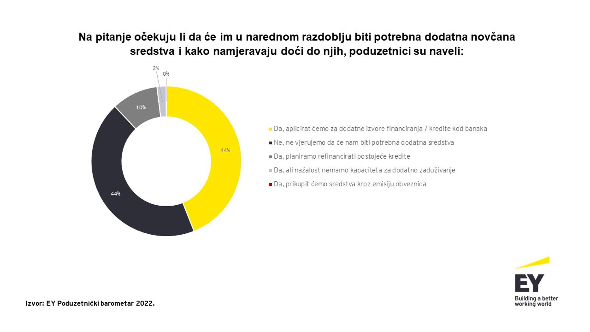 Pored toga, nešto manje od polovice ispitanih (44 posto) navodi kako će u narednom razdoblju aplicirati za dodatne izvore financiranja, odnosno kredite kod banaka.