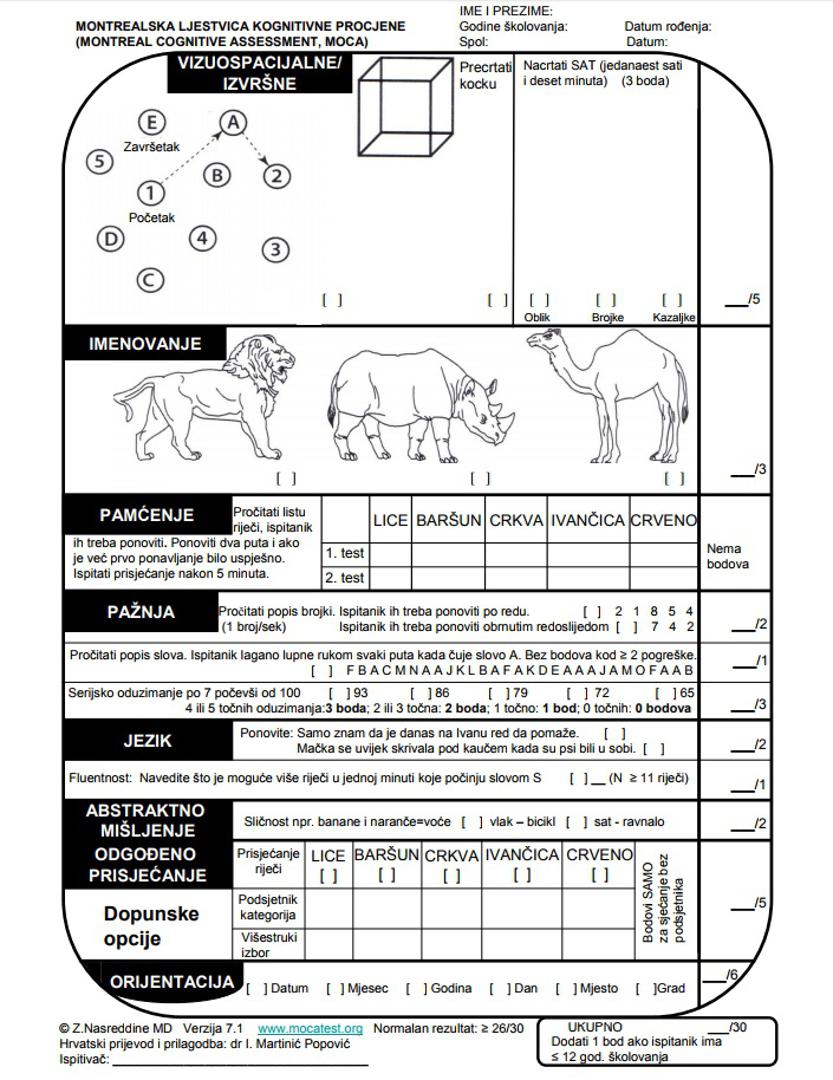 Test se rješava 10-ak minuta, a testira se ispitanikova koncentracija, pažnja, pamćenje, jezik, računanje, orijentacija... Evo kako izgleda takav test: