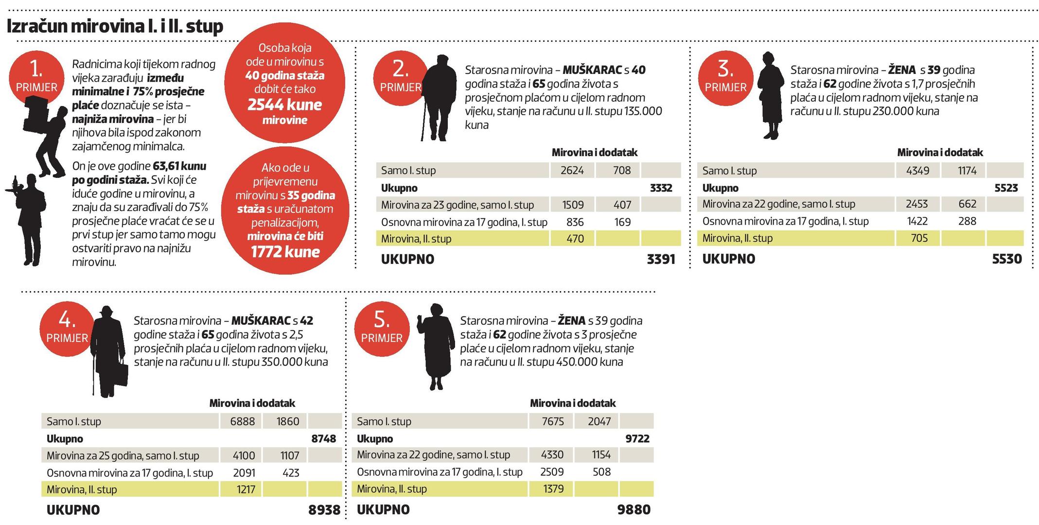 Prvi put određena mirovina kasnije će se povećati dva puta godišnje prema kretanju plaća i troškova života. Nadležne državne službe tvrde da ljudi čija je plaća tijekom radnog vijeka bila do 75 posto prosječne u državi ne trebaju ostajati u drugom stupu jer će proći lošije. Ekspert za mirovinski sustav Danijel Nestić vjeruje da će se prvih godina šest od deset novih umirovljenika vraćati u prvi stup jer će im to biti povoljnije, a tek bi se za desetak godina situacija mogla promijeniti tako da će 6 od 10 novih umirovljenika ostajati u drugom stupu! Proizlazi da će se državi vraćati radnici s manjim plaćama, a u drugom stupu ostajati bogatiji. Prvi je savjet: nikamo bez izračuna, pa makar zbog njega izgubili dosta vremena i živaca u natezanju s nadležnim službama.