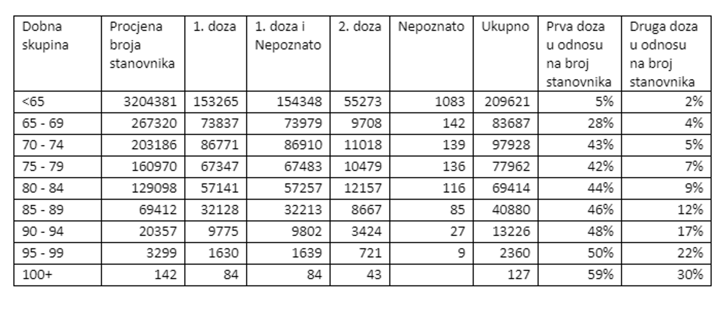 Najveći obuhvat cijepljenjem postignut je za osobe u dobi 80 i više godina, od kojih je više od 44% primilo prvu ili drugu dozu", navodi HZJZ