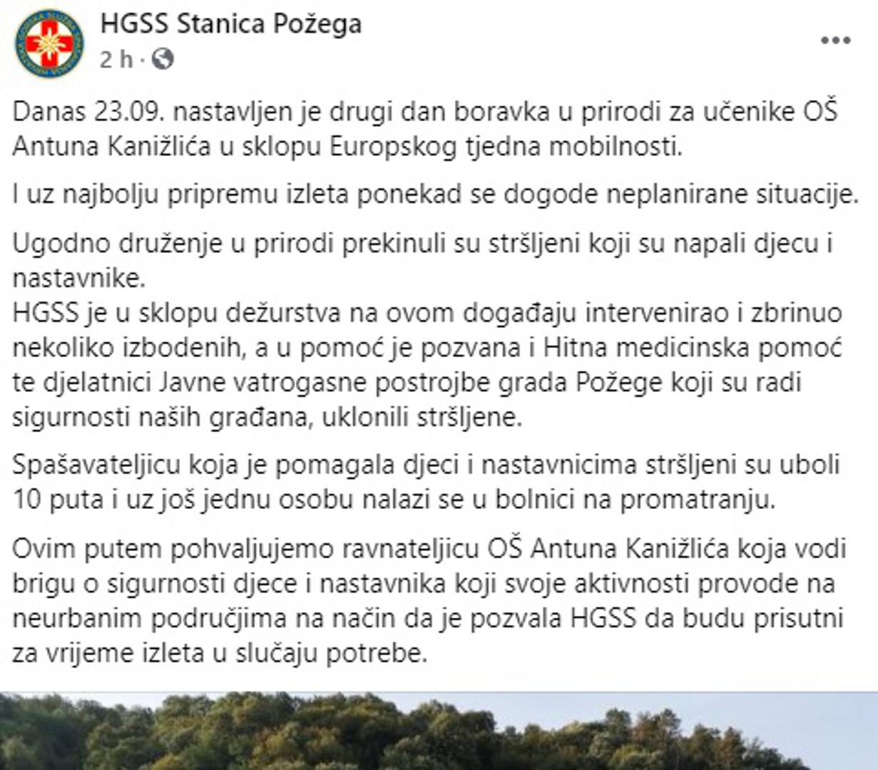 Požeški HGSS na svojim stranicama objavio je kako je danas tijekom drugog dana boravka u prirodi za učenike OŠ Antuna Kanižlića u sklopu Europskog tjedna mobilnosti morao intervenirati. Ugodan boravak u prirodi prekinuli su stršljeni koji su napali djecu i nastavnike.