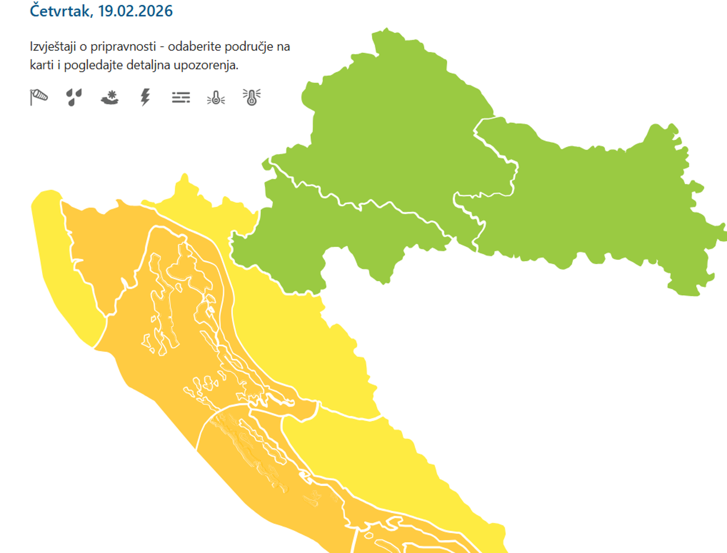 Hrvatsku čeka promjenjivo vrijeme s južinom, kišom, pljuskovima i grmljavinom, ali i snijegom. Oborina će danas biti na jugu uglavnom poslijepodne, na istoku tek navečer. Obilnih oborina će biti ponajviše na Jadranu i predjelima uz njega. U noći na petak kiša će ponajprije u gorju prelaziti u snijeg. Puhat će umjeren južni i jugoistočni vjetar, ponegdje i jak, a u Gorskoj Hrvatskoj na udare olujan jugozapadni. Najviša dnevna temperatura uglavnom između 10 i 15 °C.