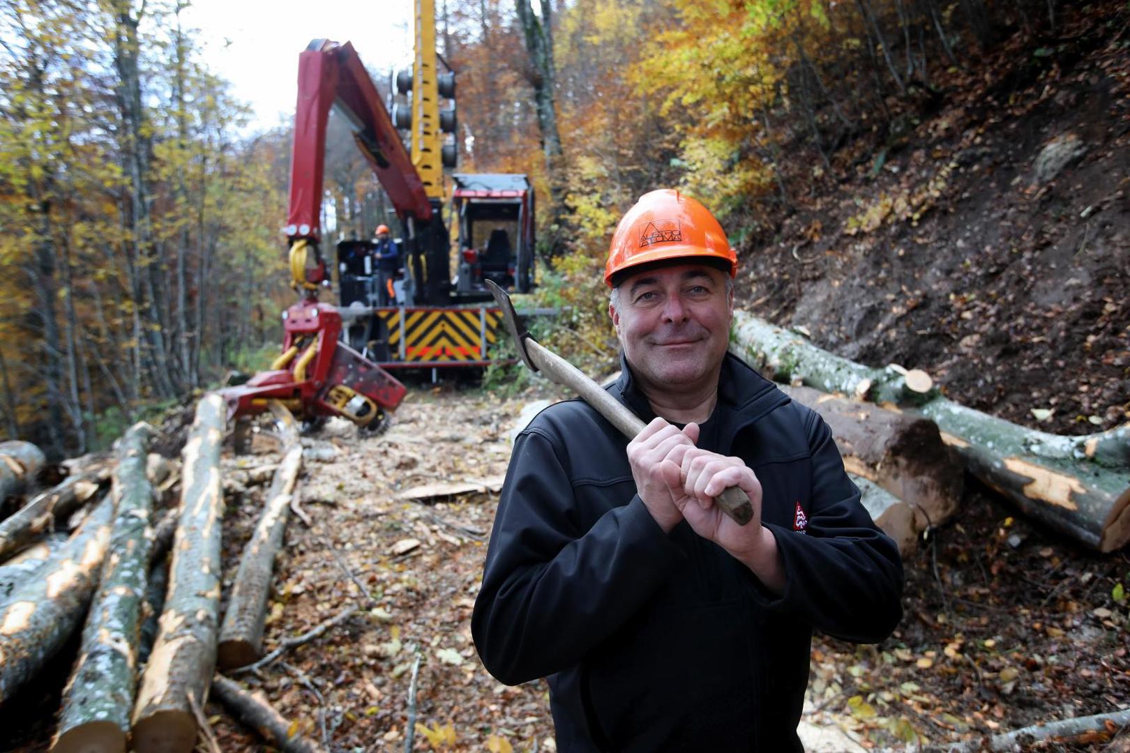 Na proplanku, na 1110 metara nadmorske visine gdje je miris jeseni bio još intenzivniji, iza na metrice posloženih drva koja će se prodati na licitaciji, za razliku od trupaca za koje su s kupcima unaprijed sklopljeni ugovori, ispred sebe ugledasmo grdosiju od stroja u čijem je kokpitu s joystickom u rukama ležerno zavaljen Danijel Trupković prema kojem zrakom “putuje” stablo. Danijel ga spušta, obrađuje, premješta... Sve pritiskom na gumbe.