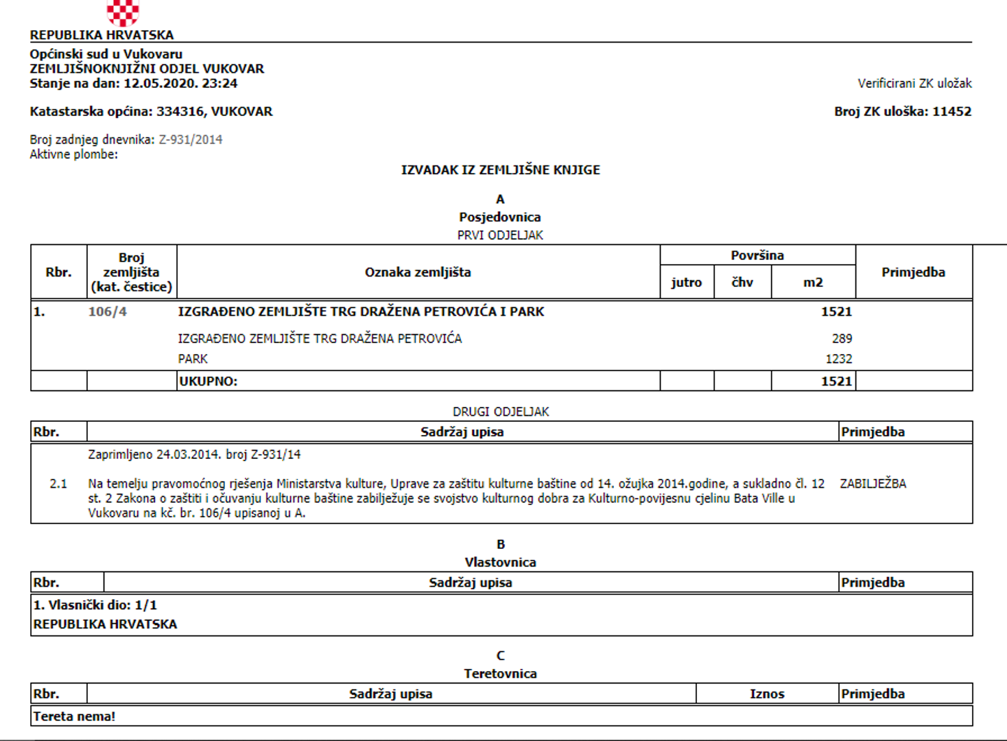 - Očevidom je utvrđeno kako se na istoj nalazi izgrađen hotel s jedanaest katova, a koji je izgrađen između 1936. i 1940. godine. RH je vlasništvo nad predmetnom nekretninom stekla 1997. godine. Zgrada hotela izgrađena na predmetnim nekretninama nije evidentirana u zemljišnoj knjizi. Republika Hrvatska, kao stranka u različitim imovinskopravnim postupcima, koji se vode, bilo pred nadležnim općinskim i drugim sudovima, bilo pred nadležnim tijelima jedinica lokalne i područne samouprave svakodnevno stječe mnoštvo nekretnina u svoje vlasništvo, stoji u odgovoru ministarstva.