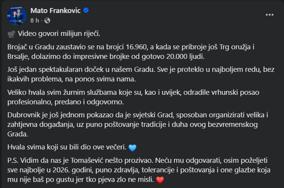 "Video govori milijun riječi. Brojač u Gradu zaustavio se na brojci 16.960, a kada se pribroje još Trg oružja i Brsalje, dolazimo do impresivne brojke od gotovo 20.000 ljudi. Još jedan spektakularan doček u našem Gradu. Sve je proteklo u najboljem redu, bez ikakvih problema, na ponos svima nama. Veliko hvala svim žurnim službama koje su, kao i uvijek, odradile vrhunski posao profesionalno, predano i odgovorno.