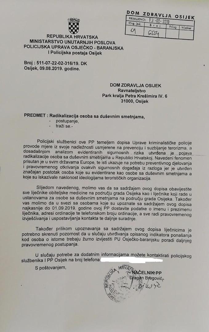 Također, pri upoznavanju sa sadržajem ovog dopisa liječnicima je potrebno skrenuti pozornost da u slučaju utvrđivanja opisanog indikatora ponašanja kod osoba o istome treba žurno izvijestiti PU osječko-baranjsku radi daljnjeg pravovremenog postupanja”, stoji u dopisu policije.