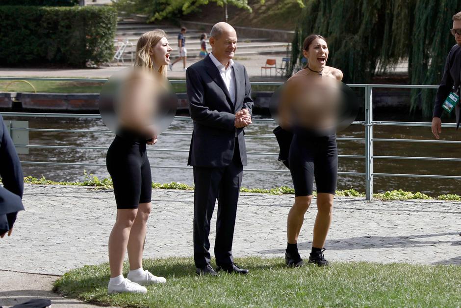 Dvije aktivistkinje su iznenadile njemačkog kancelara Olafa Scholza s kojim su se u nedjelju fotografirale, skinuvši se do pasa i tražeći "embargo na plin, odmah" uperen protiv Rusije.