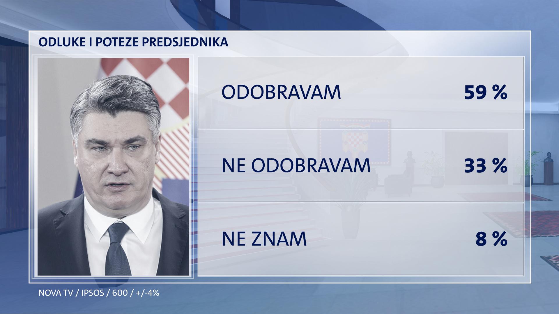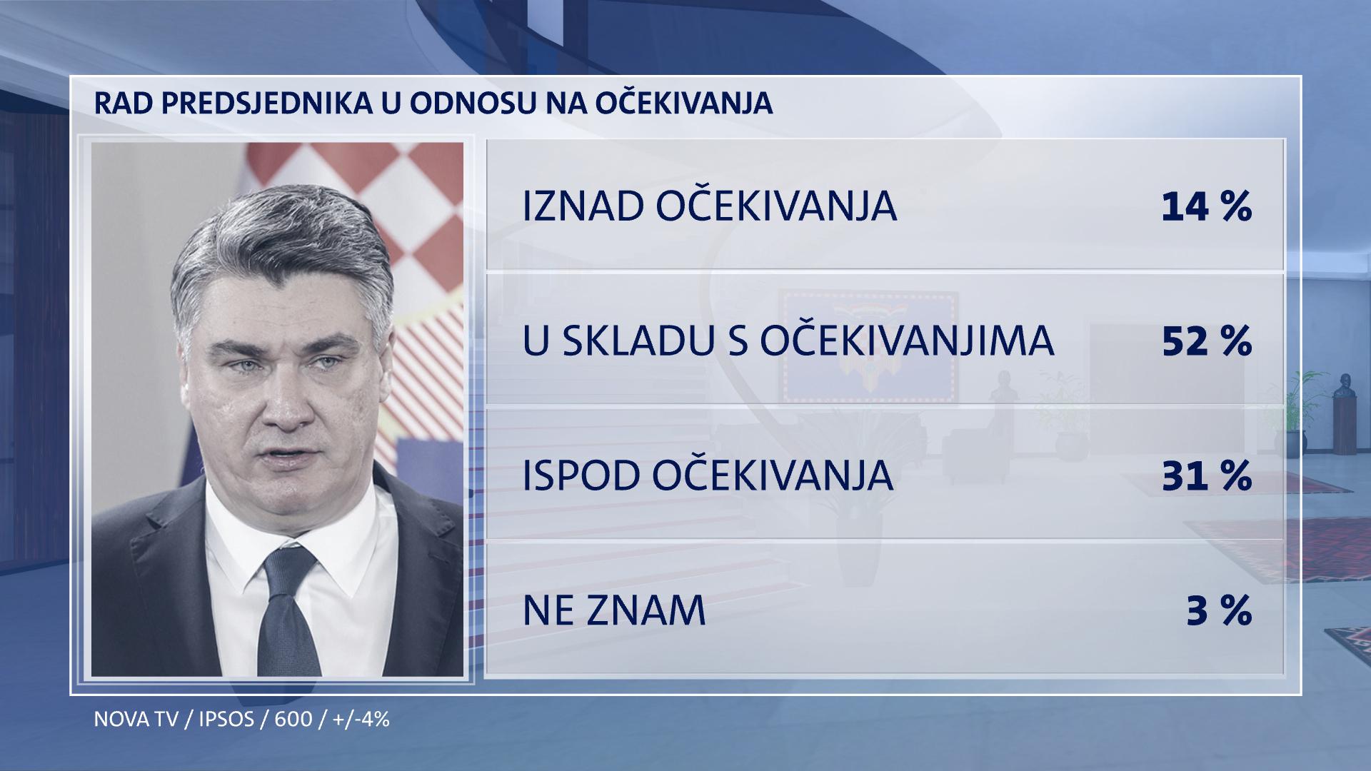 Većina građana, odnosno 59 posto odobrava Predsjednikove poteze i odluke, dok 33 posto ne odobrava njegov rad. Ne zna 8 posto. Predsjednik dobro stoji kod mlađih birača, u Zagrebu i okolici (65%), na Kvarneru i u Istri (61%), ali i u Dalmaciji (60%). Protivnici njegova rada su generacija od 45 do 59 godina (43%), osobe s osnovnom školom (40%) te u Slavoniji (45%).