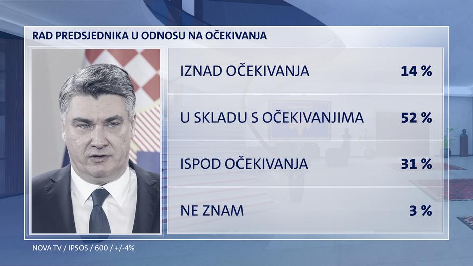 Većina građana, njih 52 posto u skladu s očekivanjima ocjenjuje dvije godine mandata Zorana Milanovića. Za 31 posto građana njegov rad je ispod očekivanja. A da je iznad očekivanja misli 14 posto građana. Najstabilniju potporu ima kod mladih birača, SDP-ovaca, opet Domovinskog pokreta i MOSTA pa MOŽEMO! i HDZ-a.