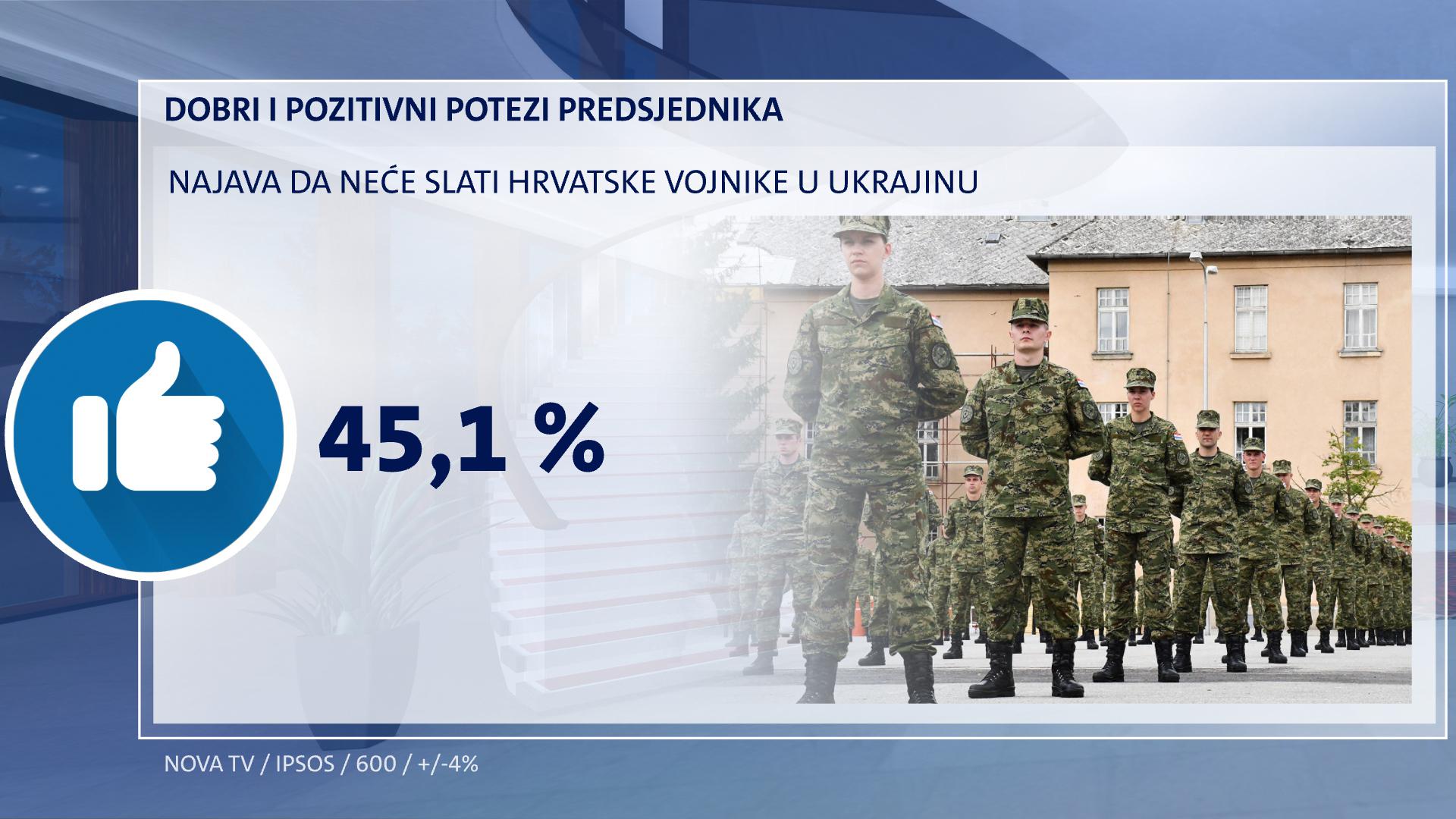 Na prvom mjestu tako se našla poruka da neće slati Hrvate u Ukrajinu. To odobrava 45,1 posto ispitanika. Veću potporu ima među mlađom populacijom, oporbenim biračima, a samo 28 posto birača HDZ-a to odobrava.