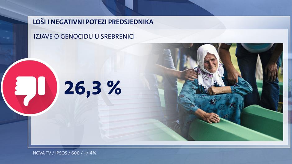 Predsjednikove izjave o genocidu u Srebrenici osuđuje 26,3 posto ispitanika. Veći kritičari su muški birači, u Zagrebu i okolici na Kvarneru i u Istri te među biračima HDZ-a.
