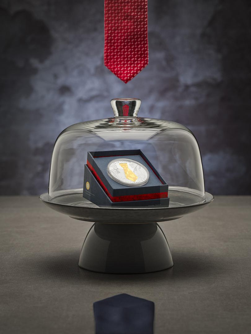 Tema kravate proteže se i ambalažom u kojoj je prigodno pohranjena vaša zlatna i srebrna numizmatička kovanica „Konturna kravata“, koja bi mogla postati dragocjen poklon vama dragoj osobi. Ambalažu s motivom kravate potpisuje Design Bureau Izvorka Jurić, koji se poigrao ovom snažnom simbolikom i dao joj suvremeno tumačenje.
