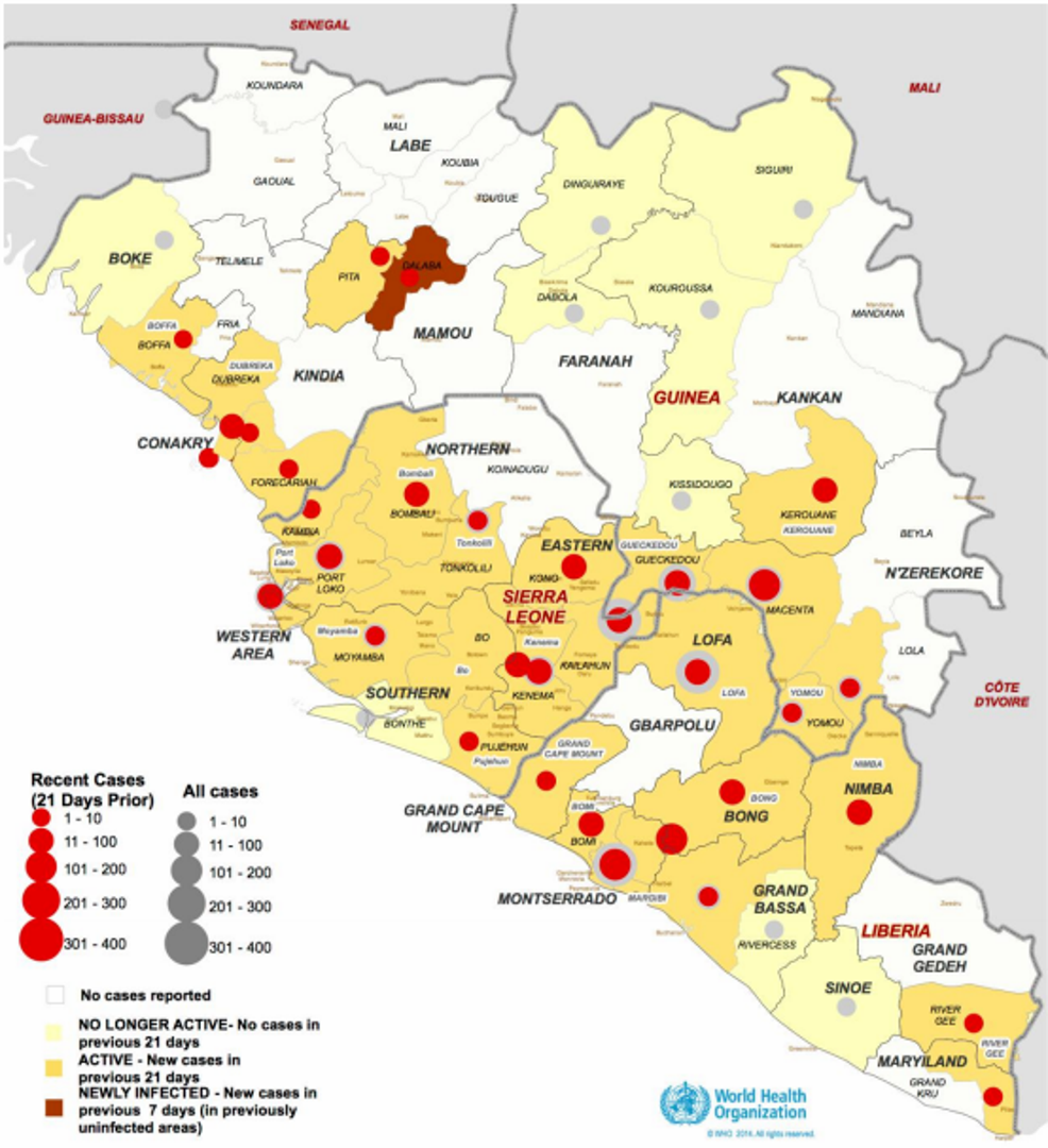 Svjetska zdravstvena organizacija jučer je objavila dokument Ebola Responske Roadmap prema kojem razdvaja zemlje kojima prijeti ebola na dvije skupine: s raširenim i intezivnim prijenosom bolesti (Gvineja, Liberija i Sierra Leone) te na one gdje se bilježe inicijalni slučajevi i lokaliziran prijenos bolesti (Nigerija, Senegal).