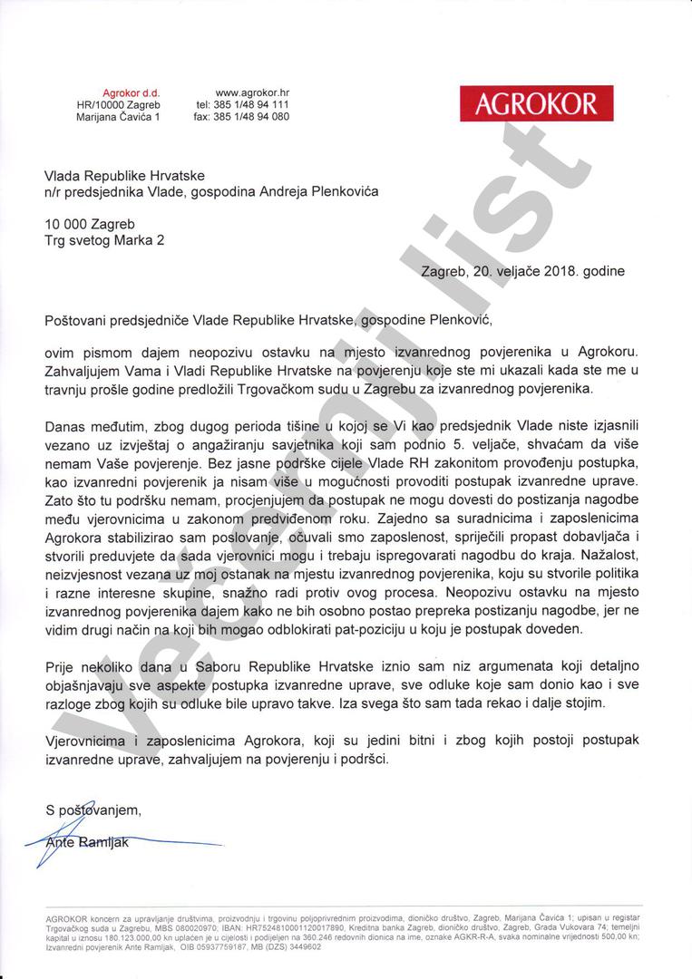 – Nažalost, neizvjesnost vezana uz moj ostanak na mjestu izvanrednog povjerenika, koju su stvorile politika i razne interesne skupine, snažno radi protiv ovog procesa. Neopozivu ostavku na mjesto izvanrednog povjerenika dajem kako ne bih osobno postao prepreka postizanju nagodbe, jer ne vidim drugi način na koji bih mogao odblokirati pat-poziciju u koju je postupak doveden – tvrdi Ramljak.