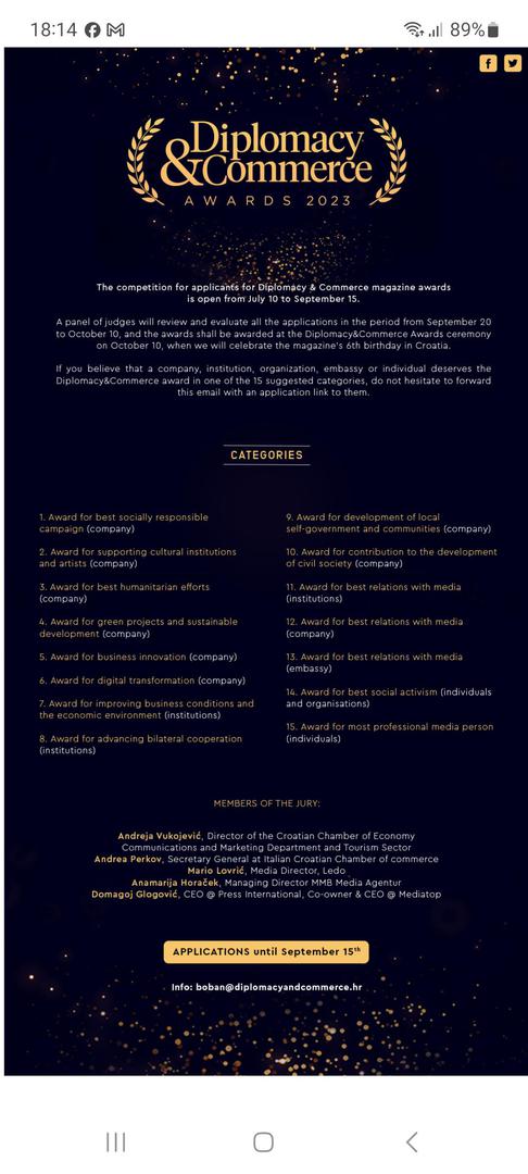 „Ako vjerujete da tvrtka, institucija organizacija, veleposlanstvo ili pojedinac zaslužuju nagradu Diplomacy&Commerce u jednoj od 15 kategorija, ne oklijevajte proslijediti ovaj mail s poveznicom za apliciranje“, piše im na stranici od otvaranja natječaja. Netko je očito proslijedio. A aplicirao je EOS Matrix.