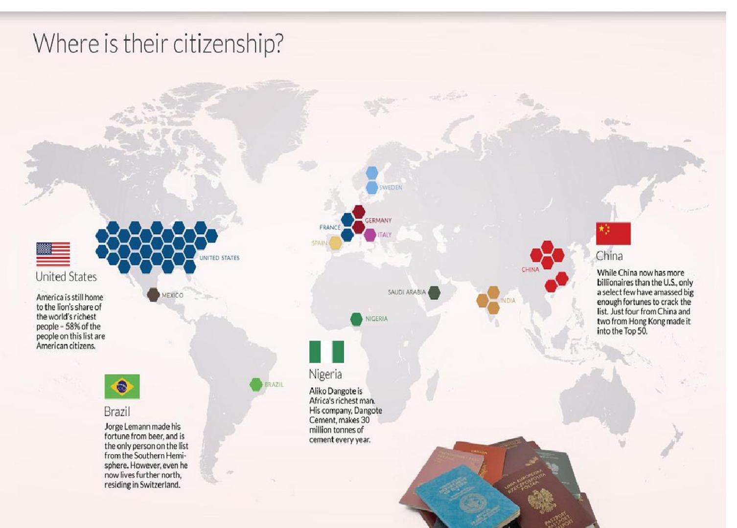 Najveći broj bogataša živi u SAD-u, njih 58 posto. Ostatak živi u Europi (16 posto) i Kini (12 posto). Najmlađi je milijarder Facebookov Mark Zuckerberg koji ima 31 godinu, a najstarija je 93-godišnja Liliane Bettencourt, glavna dioničarka kozmetičke tvrtke L'Oréal.
