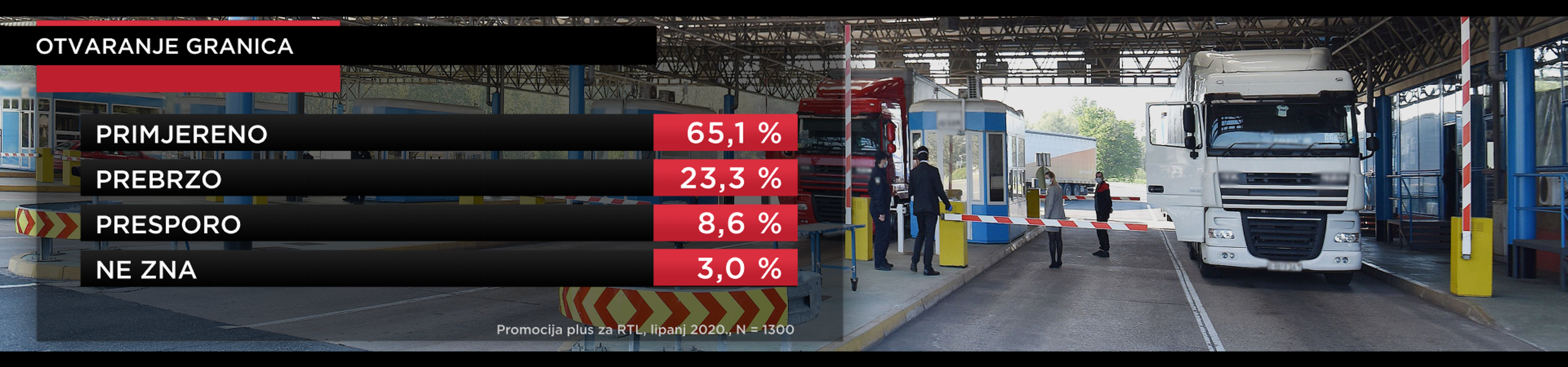 Da su hrvatske granica strancima i turistima otvorene primjereno dominantan je stav među ispitanicima - 65,1 posto. Da se granice otvaraju prebrzo poručuje gotovo četvrtina, a da je dinamika prespora i da se to trebalo i ranije učiniti poručuje manje od 9 posto ispitanika.