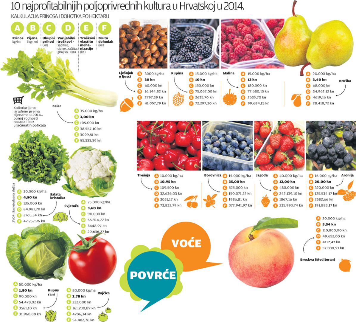 Na kupini se po prosječnoj cijeni od 10 kuna za kilogram i prinos od 15 tona po hektaru, kad se odbiju svi troškovi, može dobiti i 72 tisuće kuna, a kao kraljice među bobičastim voćem, prema Savjetodavnoj službi, slove borovnica i jagoda. Uz prosječnu cijenu od 35 kuna za kilogram, na hektaru borovnice ubere se i 525.000 kuna slatkih plodova, a jagoda 480.000 koji proizvođaču u konačnici donesu 373 tisuće, odnosno 236 tisuća kuna bruto dohotka. Isplati se i kruška, s kojom Hrvatska ne pokriva ni 40% vlastitih potreba, a donosi oko 28.000 kuna po hektaru, a breskva u priobalju i 57 tisuća. Oko oraha i lješnjaka nema puno posla, lani je kilogram oljuštenih u trgovini dosezao i 200 kuna, a otkup u ljusci 30 kuna, što je poljoprivredniku značilo bruto dohodak od 35 tisuća u orahu i 20 tisuća kuna za lješnjak. Ivković kaže kako još nije kasno da se uz dobru i pametnu poljoprivrednu politiku s novcem EU za ruralni razvoj u dizanje voćarske proizvodnje uloži oko milijarda eura, koja bi RH brzo dovela do izvoznice nekoliko sorti voća za oko 350 mil. eura, čime bi se zaposlilo najmanje 20.000 obiteljskih poljoprivrednih gospodarstava. Zagrebački povrćar Stjepan Horvat nedavno je za Večernji kazao da Hrvatska bez problema može izvoziti i salatu i kupusnjače. U Savjetodavnoj službi su izračunali da rani kupus donosi i 31 tisuća kuna bruto dohotka, salata 47 tisuća, a rajčica i celer na otvorenom više od 53 tisuće kuna.