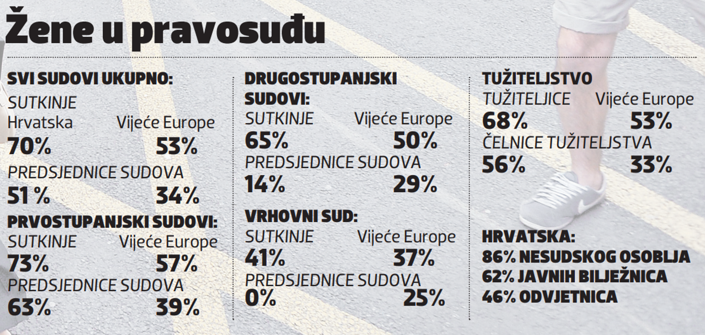 Nasuprot njima, u Hrvatskoj je pravosuđe jedno od najfeminiziranijih, a trendovi na koje CEPEJ upozorava kod nas su osobito izraženi jer je udio žena u hrvatskim sudovima i državnim odvjetništvima 15-ak postotnih poena veći od prosjeka anketiranih zemalja Vijeća Europe. Čak 70 posto sudskih i 68 posto državnoodvjetničkih dužnosti u rukama je žena, a na nižim je razinama njihov udio još izraženiji.