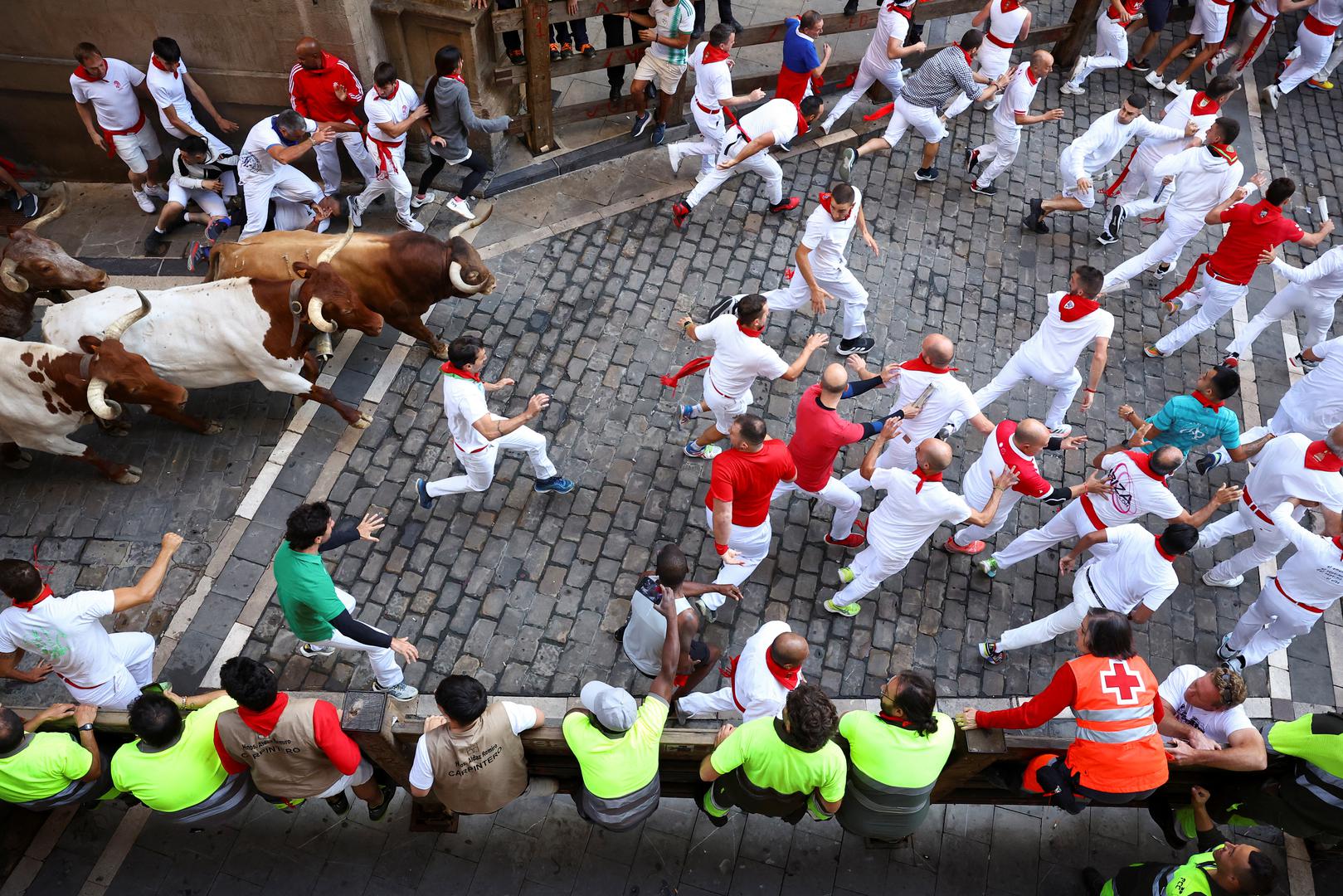 Mnogi trkači, većinom muškarci, pokušavaju trčati ispred ili pokraj šest bikova, često pokušavajući dodirnuti njihove rogove ili leđa. U nedjelju ujutro je jedan trkač pregažen.