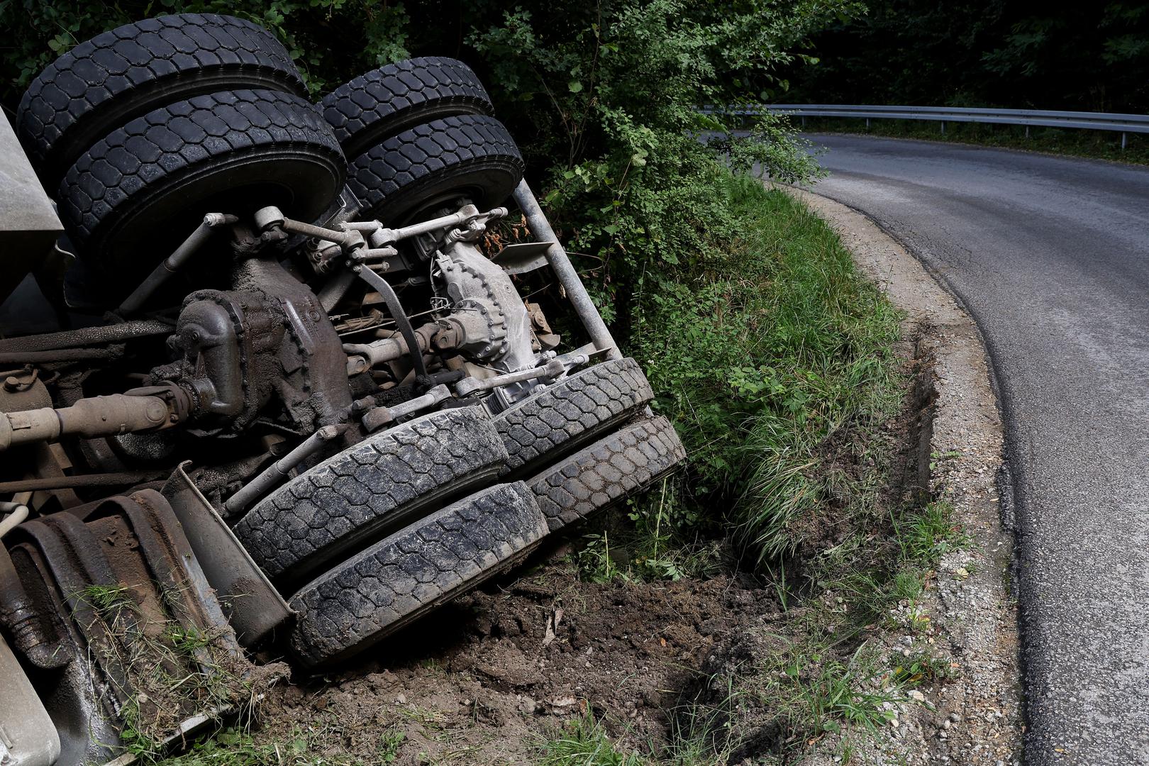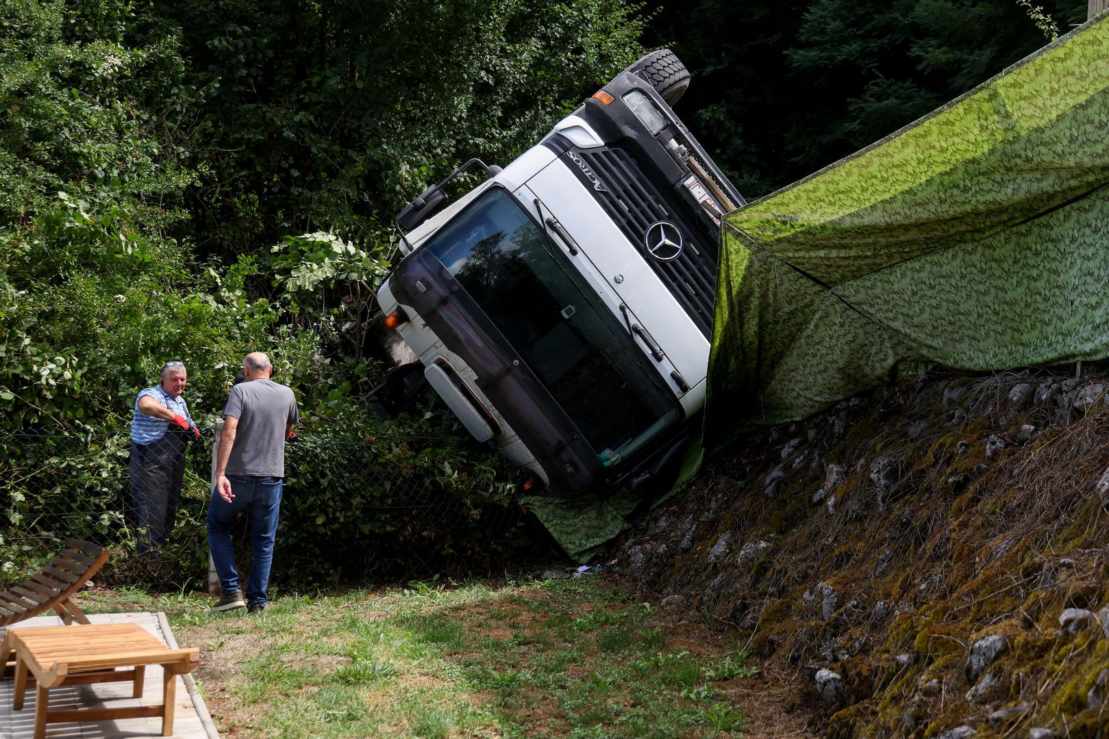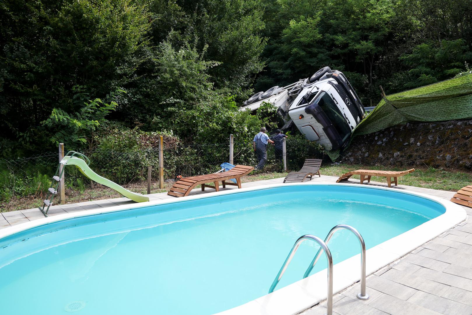 Teretno vozilo krapinskih oznaka jutros je probilo ogradu kuće i prevrnulo se tek nekoliko metara od bazena u objektu u mjestu Hrastje Plešivičko, u sastavu grada Jastrebarskog.