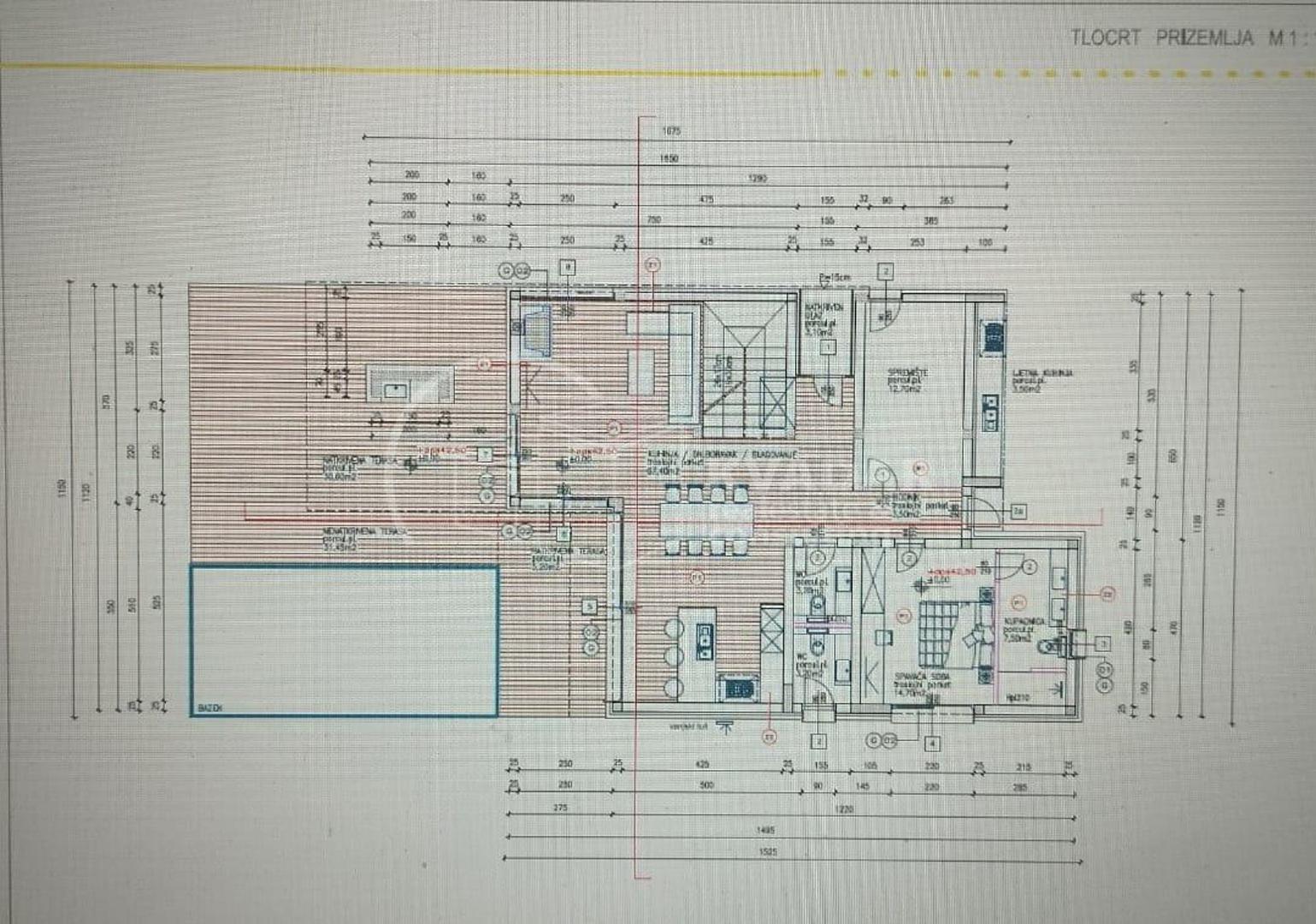 U prizemlju se nalaze ulaz, hodnik, spremište, spavaća soba s garderobom, kupaonica, WC, dnevni boravak, blagovaonica, kuhinja te dvije natkrivene terase.