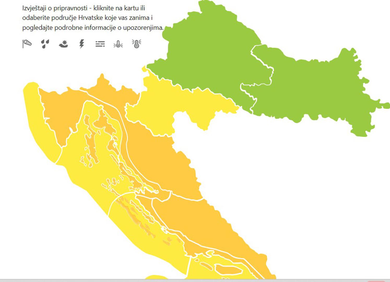 Izdana su i upozorenja za dijelove zemlje. Narančasto upozorenje izdano je u srijedu za gospićku, kninsku, riječku i splitsku regiju gdje se očekuju veće količine oborina te mjestimice izraženi pljuskovi s grmljavinom. "Budite spremni na jača grmljavinska nevremena koja mogu prouzročiti veliku štetu i zaštitite se od munja. Moguća su oštećenja na imovini te na drveću. Moguće su lokalne bujične poplave, olujni udari vjetra i tuča. Mogući su prekidi u aktivnostima na otvorenom te u prometu", stoji u upozorenju DHMZ -a.