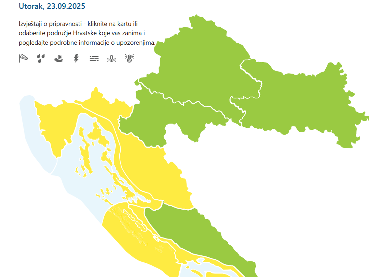 Hrvatsku je zahvatila promjena vremena. U većini krajeva danas će biti promjenjivo, na zapadu unutrašnjosti i pretežno oblačno. Povremena kiša uglavnom u središnjim predjelima, ponajprije na sjevernom Jadranu i u Gorskoj Hrvatskoj u obliku izraženijih pljuskova s grmljavinom. U istočnoj Hrvatskoj te na jugu sunčanije i suho. Najviša dnevna temperatura između 21 i 26 °C, na istoku i u Dalmaciji od 25 do 30 °C. U srijedu se očekuje mjestimice obilna oborina. Najvjerojatnija je na sjevernom Jadranu i u gorskoj Hrvatskoj, a kasno popodne i u noći u Dalmaciji. Lokalno može biti i nevremena. Zapuhat će umjeren sjeveroistočni vjetar. Na Jadranu će umjereno i jako jugo, prolazno ponegdje i olujno, od sredine dana sa sjevera okretati na sjeverozapadnjak. Najviša dnevna između 21 i 26 °C, u gorju malo niža.