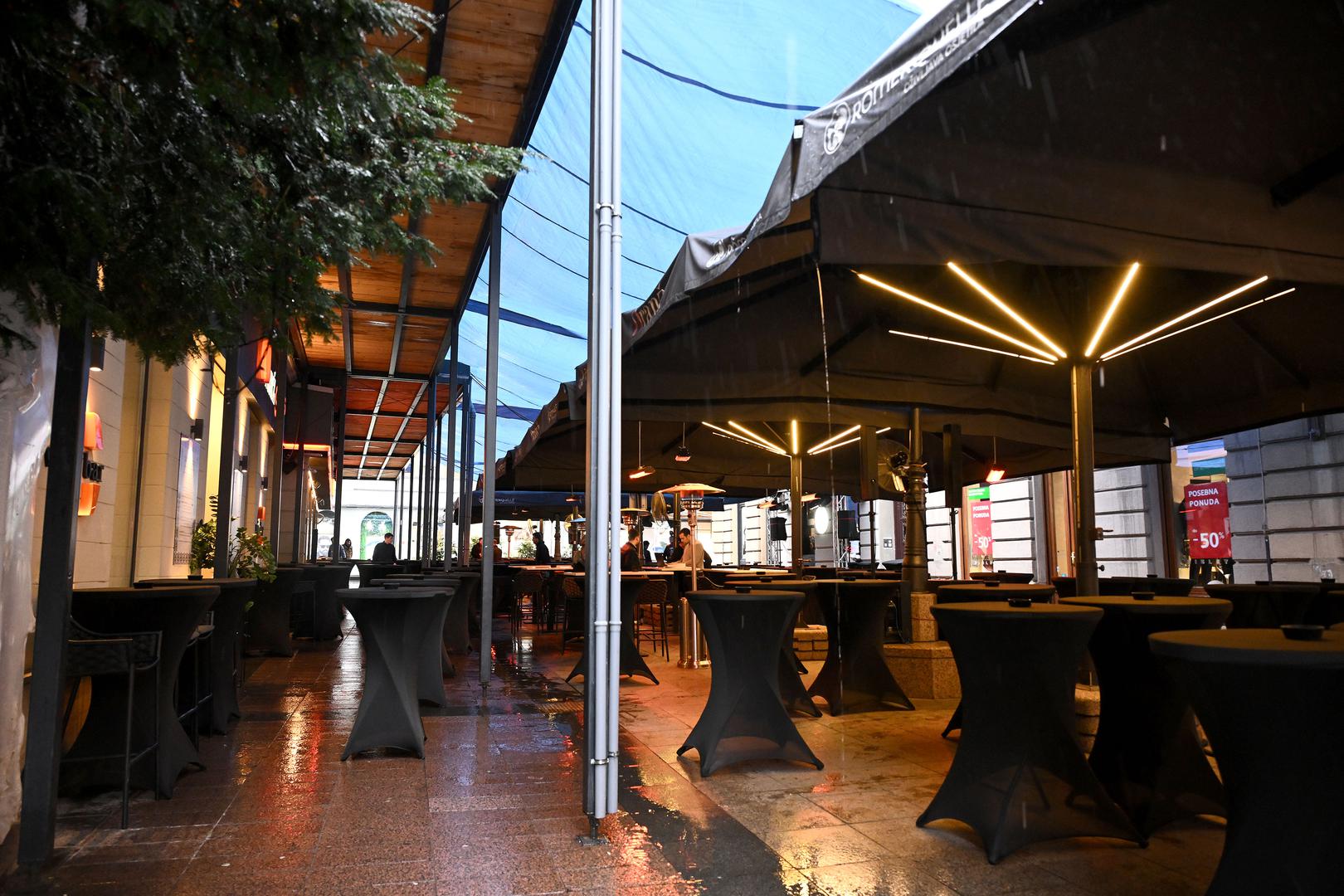 Jučer je, unatoč optimističnim prognozama, nebo odlučilo otvoriti svoje oblake, smočivši stolove i dekoracije koje su ugostitelji marljivo pripremali za današnji dernek. S Centra su već počele stizati slike slike mokre terase, cerade, tendi i kišobrana.