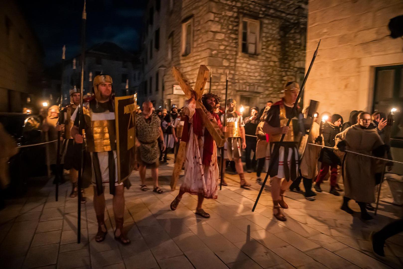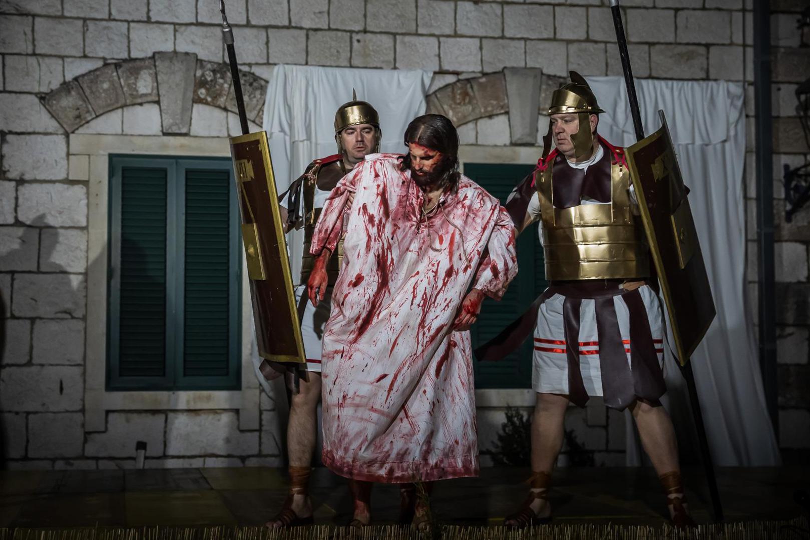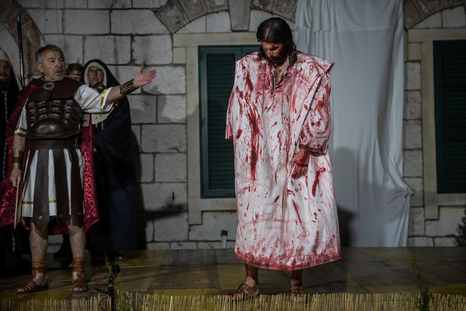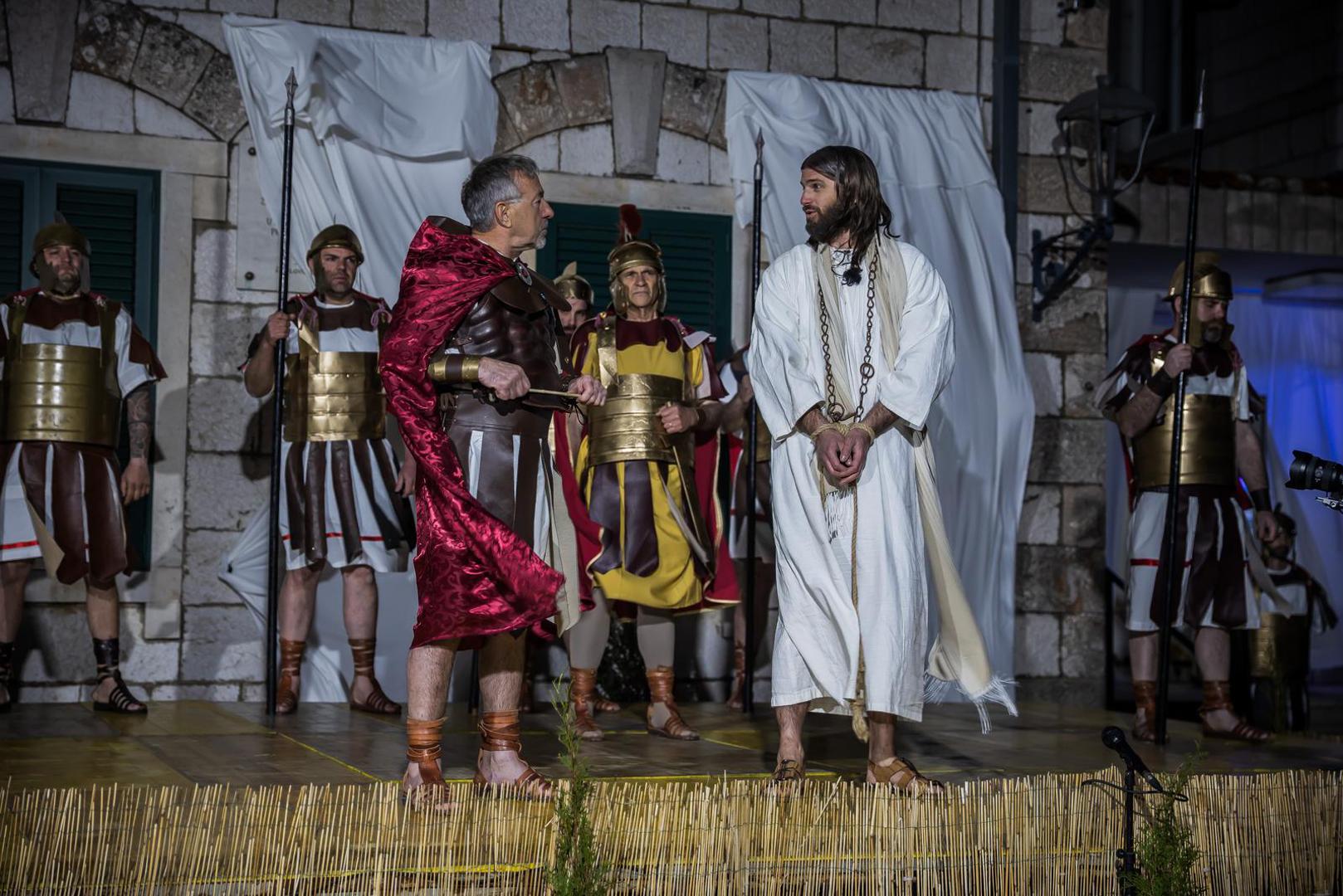 Prizor suđenja pred Pilatom započelo je zvukom truba koje su i ovu godinu svirali trubači iz Gradske glazbe Imotski. Zatim se imotska pasija nastavila mračnim i kamenitim ulicama obasjanim samo svjetlima baklji sve do središnjeg imotskog trga na čijim skalinima su se odigrali prizori Isusova susreta sa svoju majkom, židovskim ženama, Veronikom te prizor kad Šimun Cirenac pomaže Isusu nositi križ.