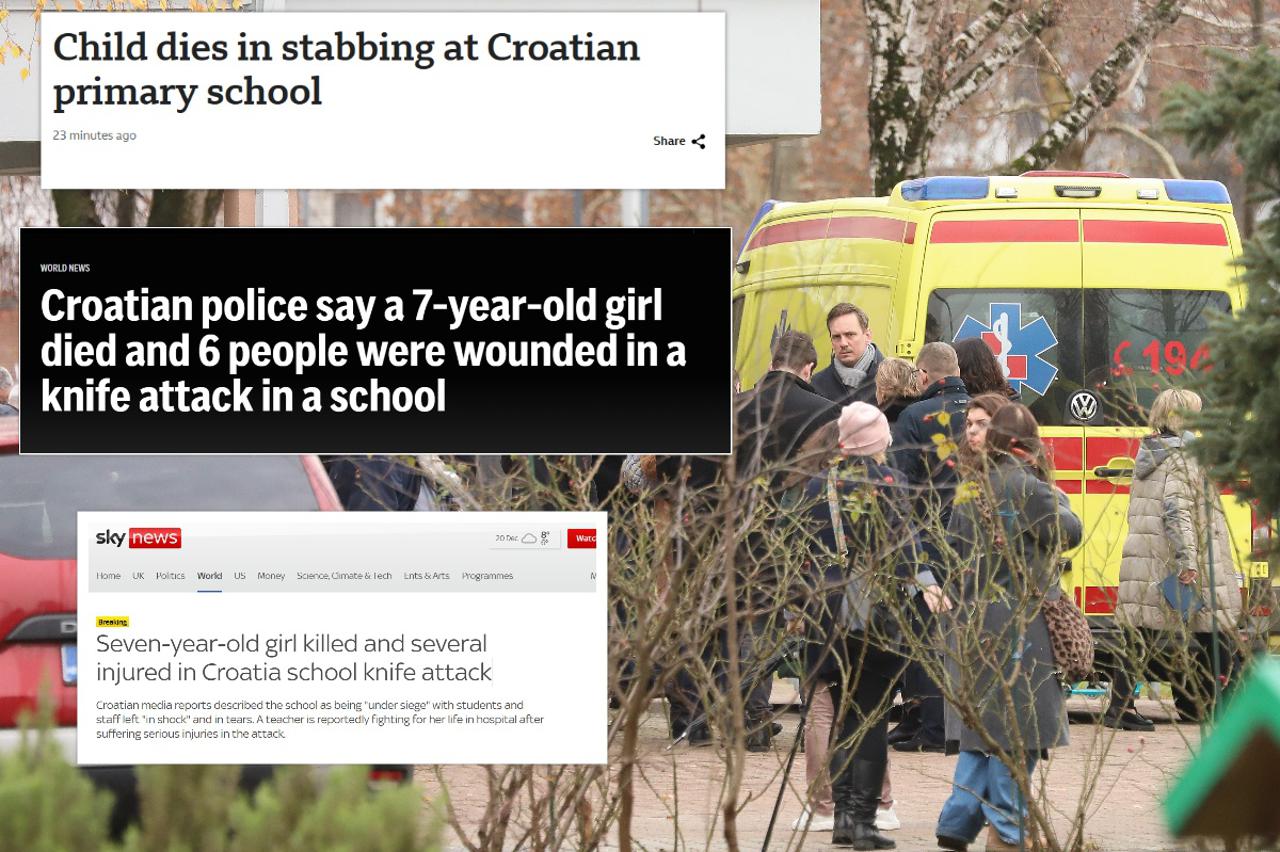 "Dijete je preminulo u napadu nožem u zagrebačkoj osnovnoj školi", naslov je na BBC-ju. I ABC piše o napadu, navodeći kako je tinejdžer upao u školu. Piše i Deutsche Welle i brojni drugi. Stravičan napad udarna je vijest i u regionalnim medijima.